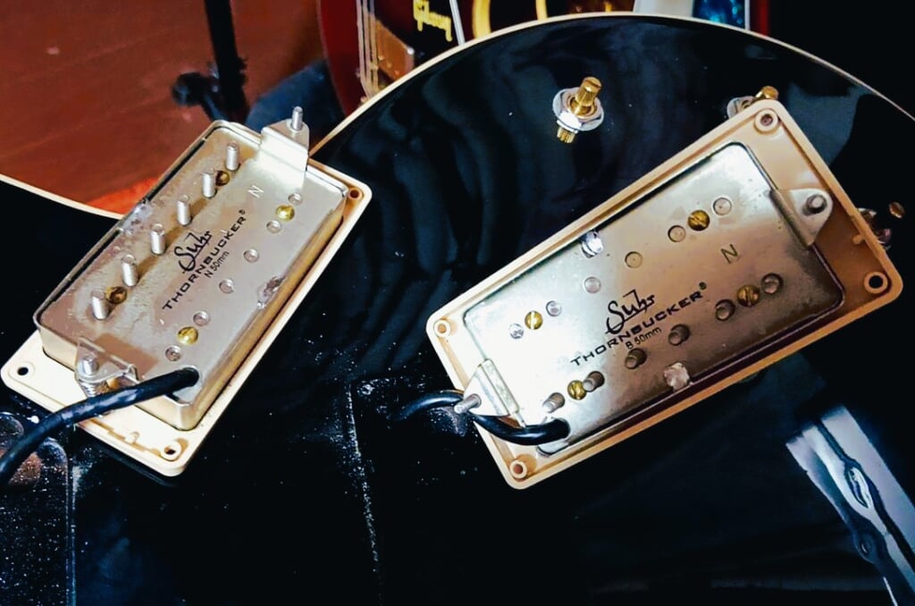 ある日フリマで「おっ」と唸らせる一品を発見。もとはクラシック。配線をやり替えてスタンダード仕様に変更。ピックアップは、suhrのthorn bucker。2021年製の若造ですが、ライブでガンガン使用したらしく、打痕と欠けが数か所あり。これぞ歴戦の証。男の勲章。モーマンタイ。オーナー様と数回のやりとりで、即購入。表も裏も真っ黒で、ツヤッツヤ。パンチあるなぁ。やっぱこうじゃなきゃ。
