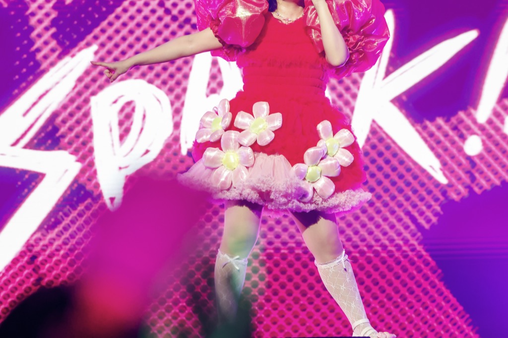 会場でまずコレンズ(コレサワのファンの通称)の視線を釘付けにしたのが、ステージに設置されたオリジナルキャラクター“れ子ちゃん”の大きな愛らしいオブジェ。開場中には“コレンズウォッチング”と称し、ステージ両端のモニターに来場者を映し出す演出もあり、開演前からフロアの熱を高めた。会場が暗転すると、オープニング映像が流れる。コレンズが武道館に集い、ステージ裏ではれ子ちゃんが緊張した面持ちでスタンバイ。幕が開くと、舞台へ踏み出していく――すると、映像と連動してオブジェのおなかに仕込まれた幕が開き、コレサワが登場。背後から差す光が彼女のシルエットを浮かび上がらせる中「かわいいもん」を歌うという幻想的な演出で、一気に引き込んだ。ステージが明るくなると同時に、コレサワも前へ。ツインテールにビビッドピンクのワンピースを纏ったその姿が観客の前に現れ、歓声が上がった。ワンピースには花のモチーフがついており、なんといっても大きなパフスリーブが目を引く。