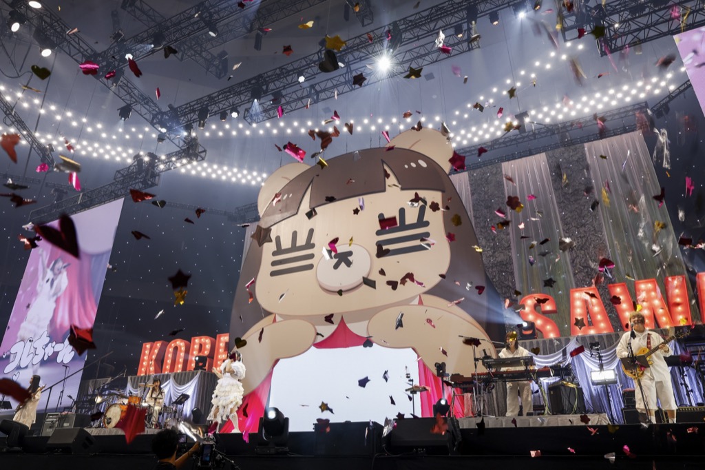 キックボードに乗って歌いながらステージを疾走した「SPARK!!」、観客がタオルを回し熱狂した「死ぬこと以外かすり傷」を演奏したあと、コレサワがステージ裏に下がり、衣装チェンジの時間へ。ひぐちけい(Gt)、U(Dr)、なかむらしょーこ(Ba)、北村真奈美(Key)といった長年コレサワをサポートする“くまさんバンド”のセッションがフロアを盛り上げた。