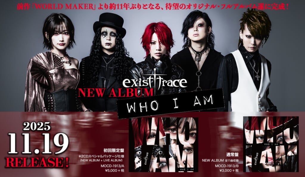 またアルバムリリースに先駆けて、10月19日に青山RizMでアルバムと同タイトルのワンマンライブ<exist†trace ONE MAN SHOW 2025 -WHO I AM->を開催することも決定。これはリリースを前に全曲をライブで披露するプレミアショーとなるものだ。