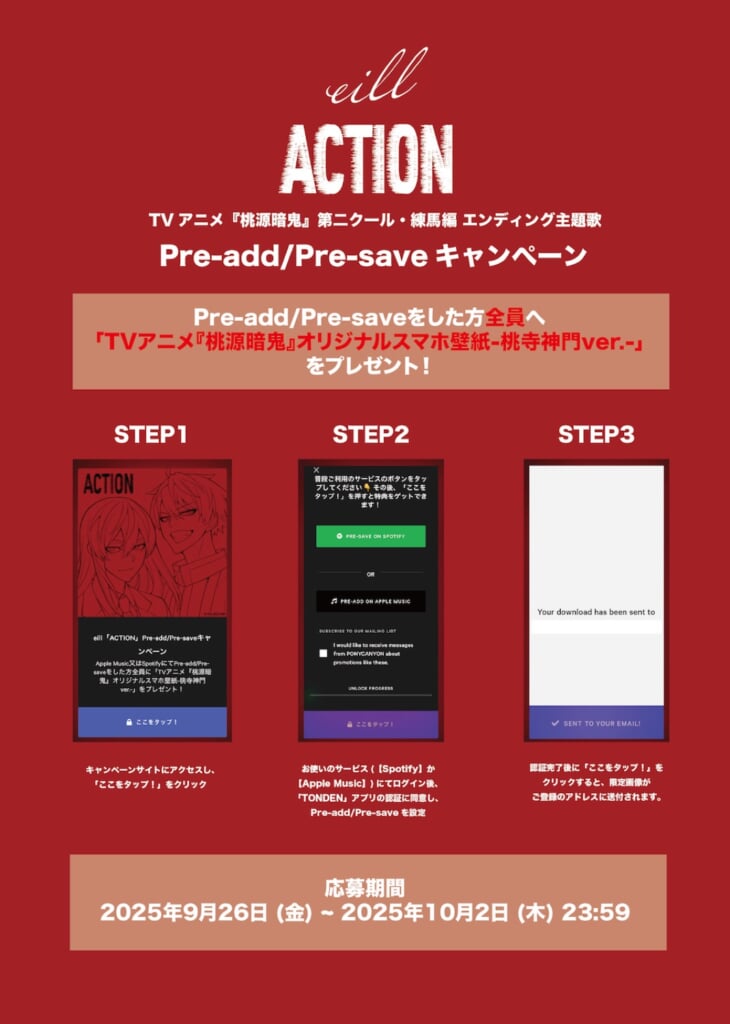 そして、9月26日から「ACTION」のPre-Add & Pre-Save キャンペーンがスタート。Apple Musicの “Pre-Add”、Spotifyの “Pre-Save”いずれかに指定のURLから登録した方に、ここだけでしかゲットできない「TVアニメ『桃源暗鬼』オリジナルスマホ壁紙-桃寺神門ver.-」をもれなくプレゼントされる。