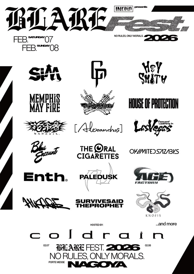 そして、3年振り3度目の開催となるcoldrain主催<BLARE FEST. 2026>の続報も到着した。全32組のゲストアーティストから第1弾ラインナップとして17組が発表されている。