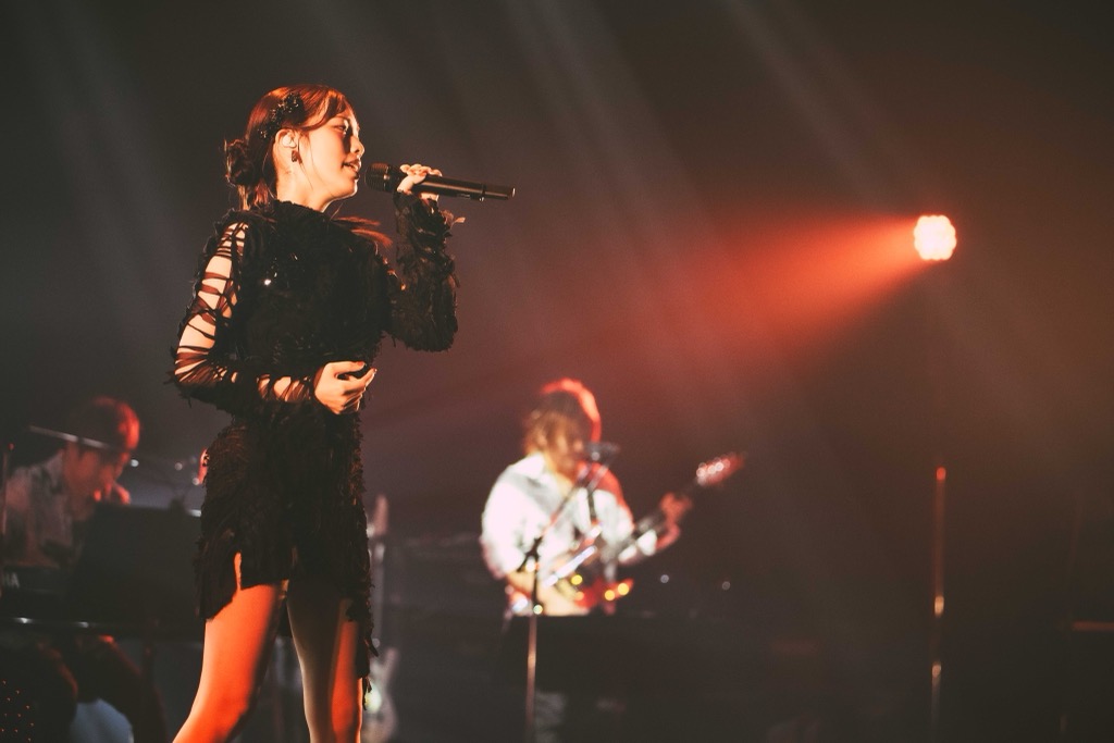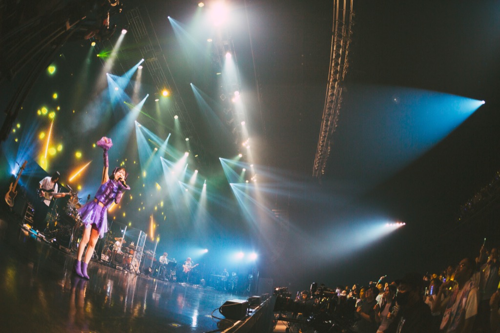 昼公演での彼女の言葉を借りれば、“このお仕事を始めてからの心境の変化 後半戦”となる“Just Me”。しっとりと始まったが、「ここからどんどん楽しい感じに盛り上がっていきますので、楽しい1日にしていきましょう!」と叫び、スイッチを切り替える。夜の町並みのシルエットを映し出した「夜とワンダーランド」では、バンドメンバー5人が揃い、疾走感あるヘヴィーなサウンドを轟かせていく。観客もオイ!オイ!と声を出し、力強いクラップを鳴らす。さらに「Twinkle Ticking」ではステージを赤く染め上げ、情熱的なパフォーマンス。美しさと力強さを両立する高音の美しさは彼女の魅力だ。