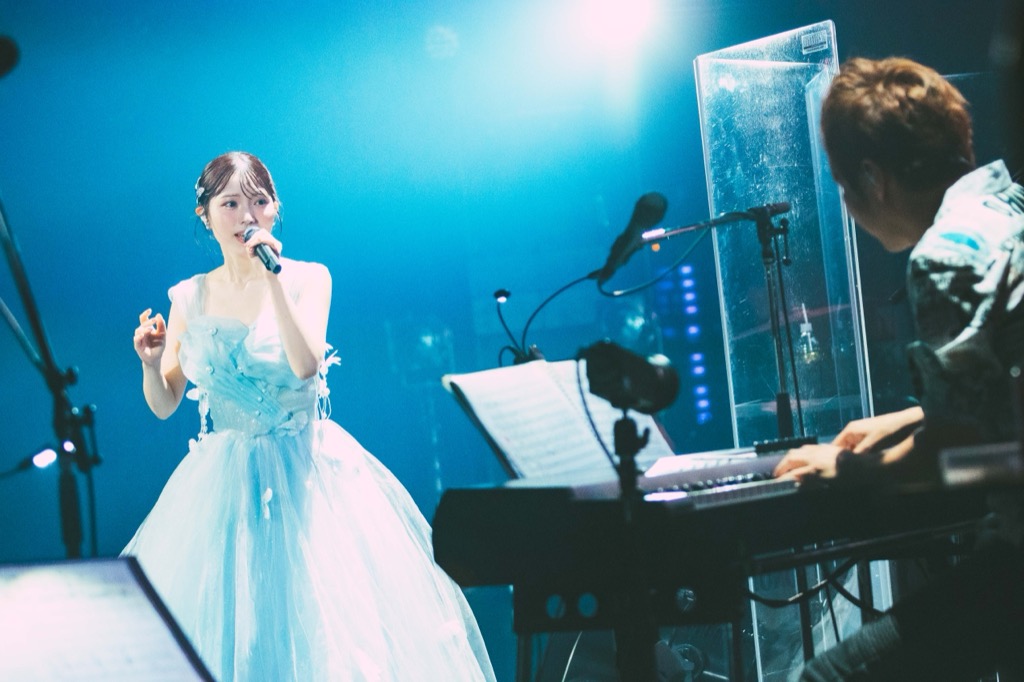 幕間映像で「As I Am」のMVでもあった、フィルム調の映像を流したあと、青色のふわっとしたオーガンジーのドレスをまとって登場した石原は、きらびやかなピアノのフレーズとタイトに放たれていく切ない歌詞のコントラストが胸に刺さる「Water Front」と、レトロなポップス「恋の匂い」を披露し、切ないムードを作っていく。そこから、ライブはアコースティックコーナーへ。