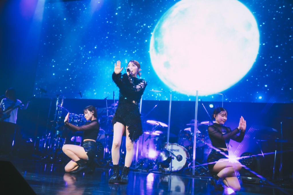 バンドによるインストを挟み、タイトなシルエットの黒い衣装に着替えた石原が、ダンサーと3人で「ムーンランナー」を披露。こちらも1st E.Pに収録されている楽曲だが、スクリーンに月と宇宙を映し出しながら、力強く芯のある歌声と妖艶なダンスで魅了していく。続く「Abracada-Boo」「ILLUSION」でも、3人のカッコいいダンスは、キレを増していった。