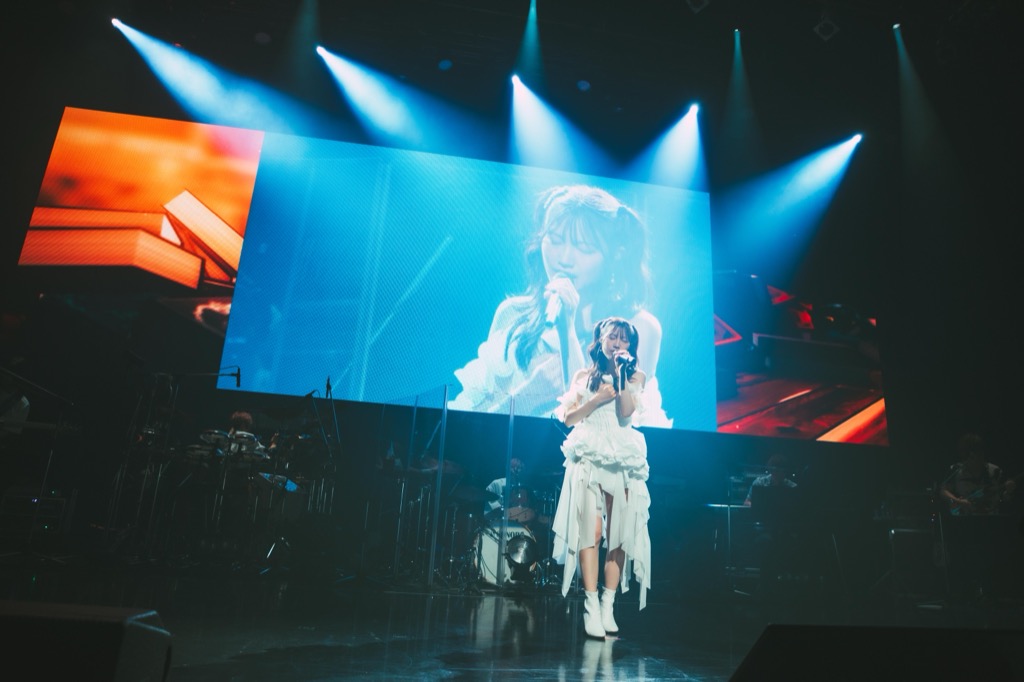 ライブの終盤、ロックナンバー「夢想的クロニクル」で、力強い歌声を響かせると、「Plastic Smile」では、アニメのタイアップ楽曲ながら、「As I Am」の世界観にも重なる歌詞にハッとする。出会いによって、世界が変わっていくんだということを伝え、シームレスにデビュー曲「Blooming Flower」へ繋がっていく。夜公演はピアノ弾き語りでなくオリジナルアレンジで、観客も大きな声を出して、盛り上がっていた。