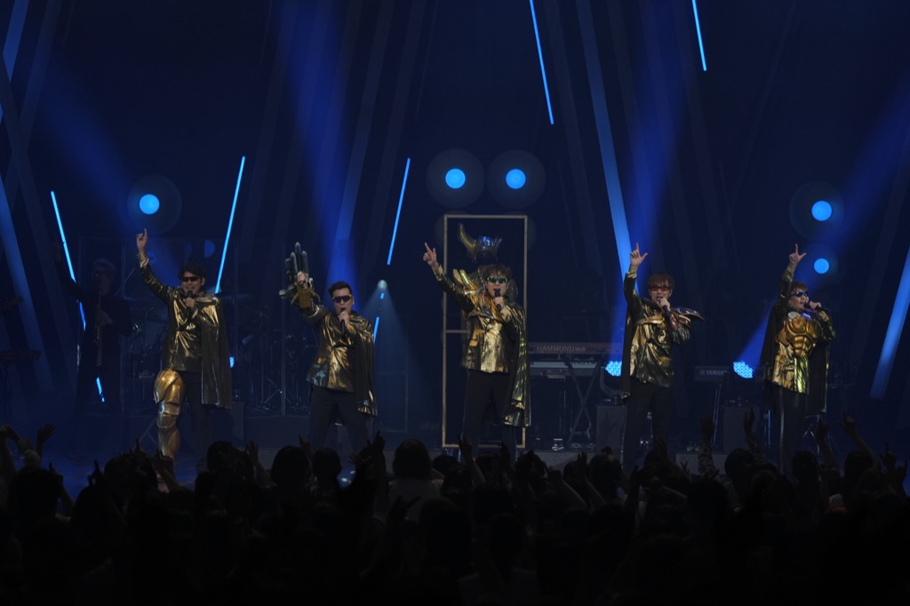 突如ステージが真っ暗になり雷音が鳴り響くと、ファンの中で崇められている愛の化身“Mr.LOVE MACHINE”が黄金の仮面とマントを纏い登場。「LOVE MACHINE」のイントロが流れ、Mr.LOVE MACHINEの魂のDNAを受け継いだ“Super LOVE MACHINES ∞”の5人が様々なパーツとお揃いのマント、メンバーカラーのサングラスを着用し登場した。バンドメンバーもサングラスを掛けて一緒にステージングをする演出も飛び出し、会場の盛り上がりも最高潮に。改めて“Super LOVE MACHINES ∞”のメンバー紹介のあと、「終わらない世界 2009」へ。冒頭歌詞の“終わらない”を村上、“世界へ”を黒沢がバトンタッチで力強いロングトーン歌唱を繰り広げると、さらに会場の熱気があがり、文字通り灼熱の空気に包まれた後半戦を締めくくった。