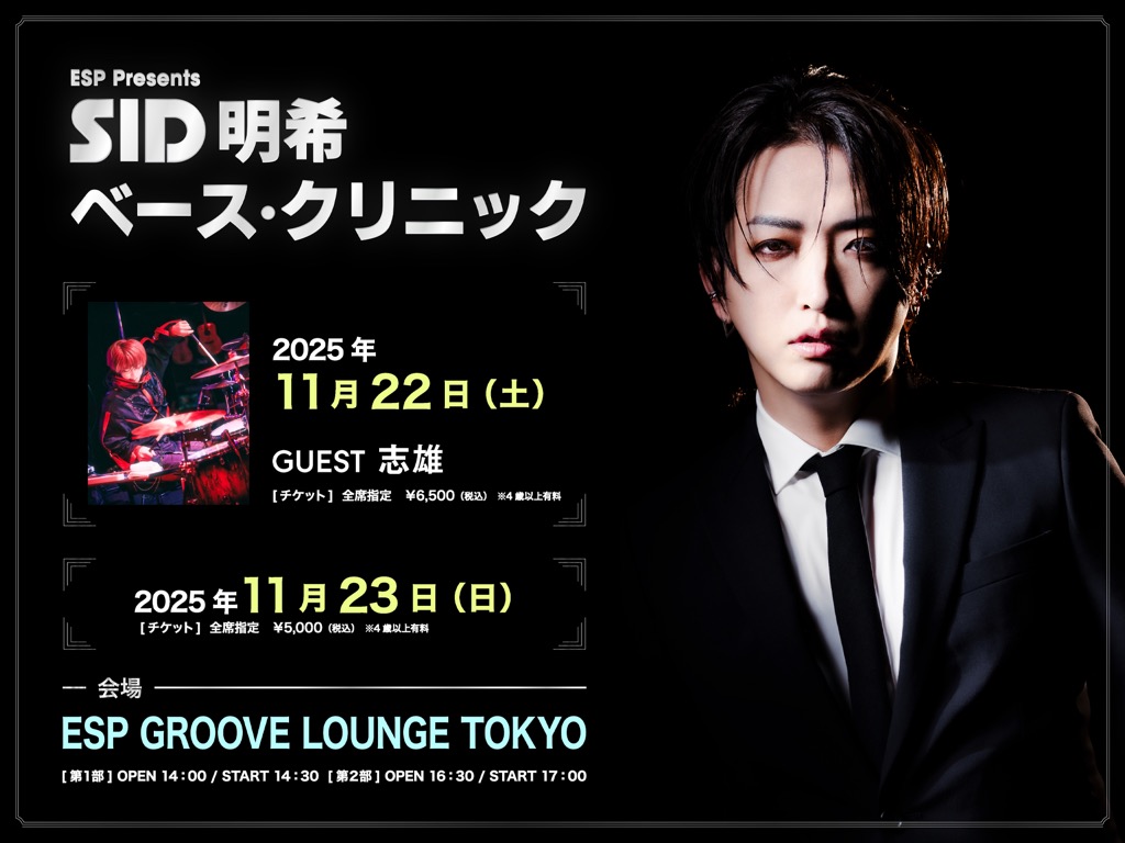 シドの明希(B)によるベース・クリニックが、11月22日(土)23日(日)の2日間にわたりESP GROOVE LOUNGE TOKYOにて開催される事が決定した。
