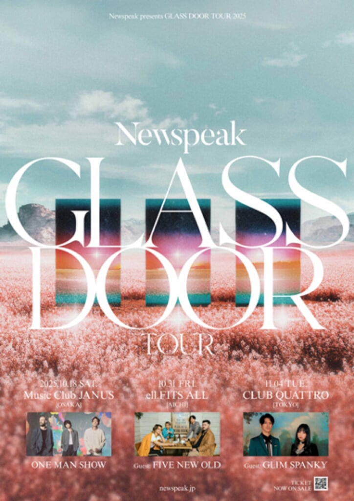 さらに今作EPを引っさげて東名阪で開催されるツアー<Newspeak presents “Glass Door Tour”>の対バン相手も先日、詳細が明らかになった。名古屋公演にはFIVE NEW OLD、東京公演にはGLIM SPANKYの出演が決定し、初日の大阪公演については諸事情により対バン出演がなくなり、急遽Newspeakのワンマンライブとして開催されることとなった。