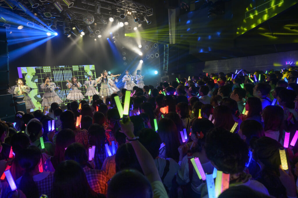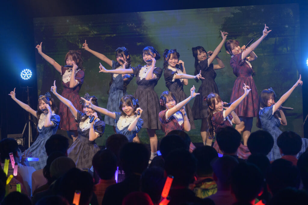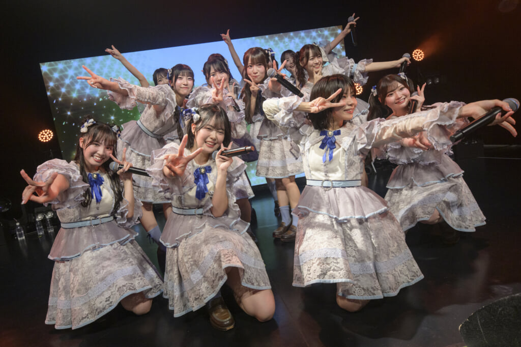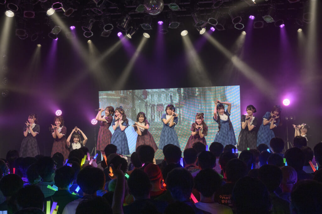 “好き”を久しぶりにたくさん聞いた橘が、さらに愛の国の11人の住人との交流を通じて忘れかけていた“愛”という感情を思い出し、徐々に笑顔を取り戻していくと、メジャーデビューアルバム「白じゃいられない」のリード曲「恋の矢印」で次のブロックに突入。12人全員がステージ前方に並んで「私はもう白じゃない」と潔く歌い切ると、遊園地のようなワクワクする映像をバックに「おまえも♡」へ。この曲でも“おれもー!”という定番コールの連呼で、会場のボルテージはさらに高まっていく。続いて、寺本理絵がイントロで「みんな、まだまだ踊り足りないよね? たくさん飛んでいくよ!」と煽ると、「ビュティホ」へ。クラップと共にサビに向かう高揚感とメンバーの高音ボーカルが映える魅力的なナンバーだ。サビではメンバーが何度もファンを煽りながらジャンプしてパフォーマンスしていく。特に後半、アカペラでの12人のユニゾンからラストのサビへと向かっていく展開は圧巻。12人のフォーメーションにも注目したくなるライブの鉄板曲と言える。続いて、橘がイントロの煽りを担当すると歓声が上がり、「夢ファンファーレ」へ。この曲は12人の振りつけがシンクロするところも見所のひとつ。