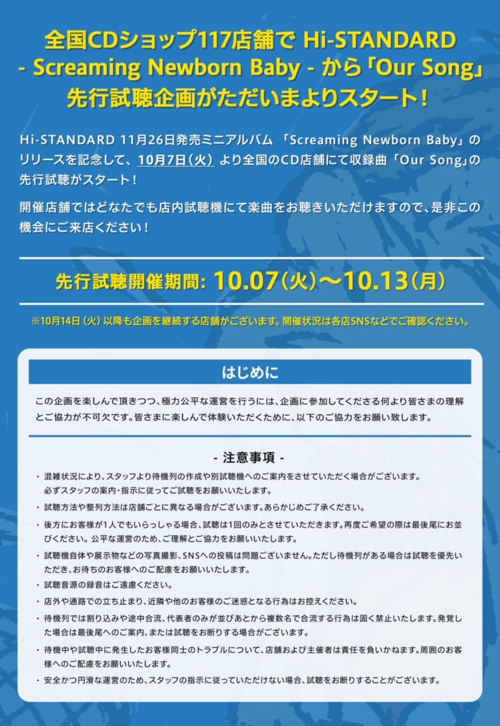 Hi-STANDARDが11月26日、ミニアルバム『Screaming Newborn Baby』をCDリリースする。これに伴って、ツアー<Screaming Newborn Baby Tour>を開催することが発表となった。