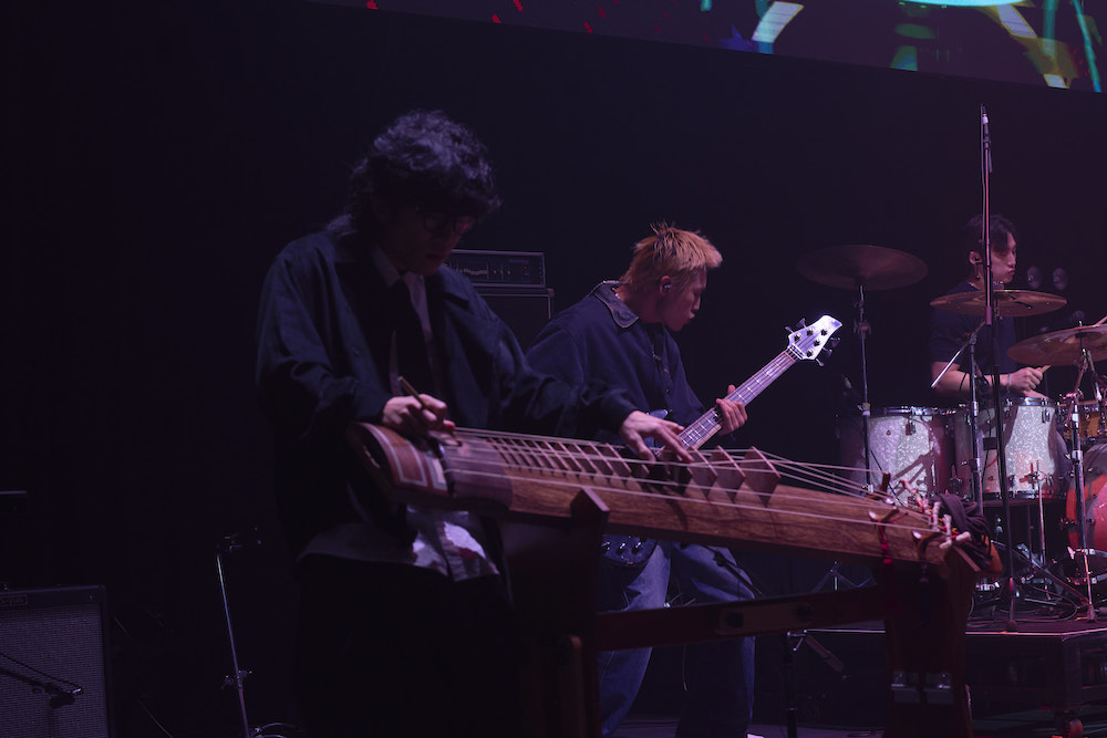 熱い空気に変わった会場をさらに熱くしたのが、この後に登場したKARDI。メンバーはアニメなどのジャパンカルチャーを愛するファン・リン(G)、尖ったビジュアルとパワーボイスが魅力のキム・イェジ(Vo)、ライブ中のアグレッシヴなプレイが印象的なファン・インギュ(B)、そして伝統弦楽器コムンゴ奏者のパク・ダウルの4人。