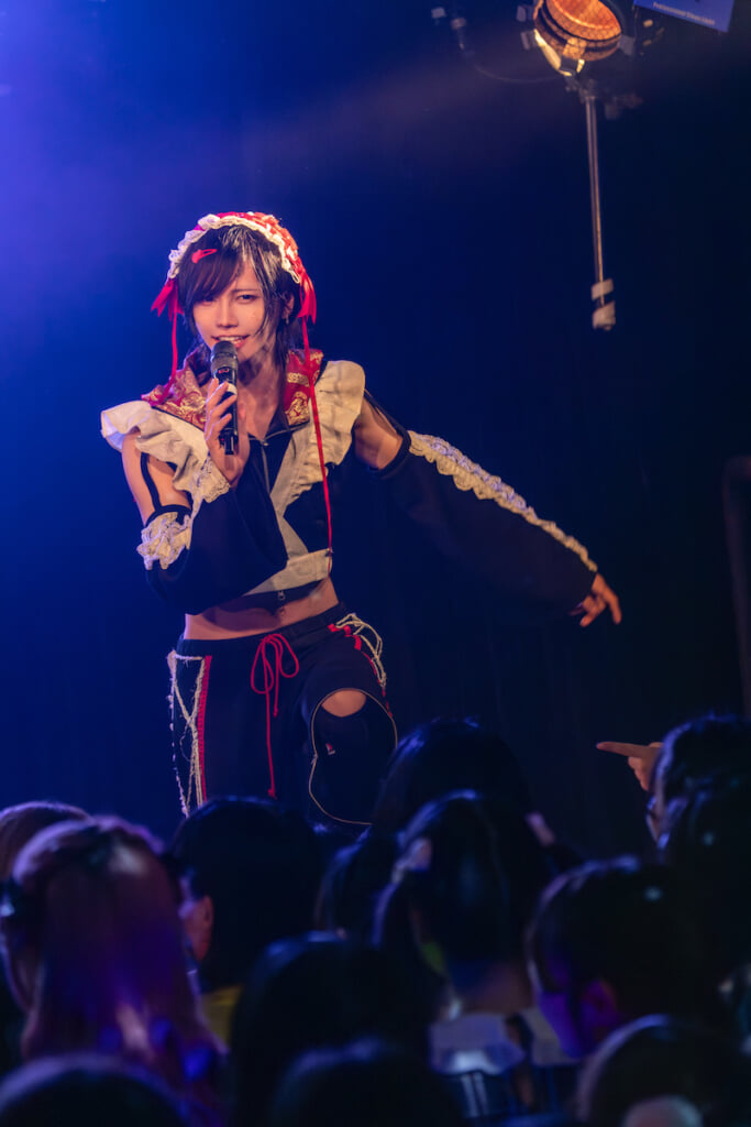 ステージでは「オオカミ男と月兎」から4曲続けて披露。メンバー同士で肩を組んだりアイコンタクトを取ったりしながら息の合ったステージを見せた「きゅーとぴあ」、前後左右にモッシュが巻き起こった「tetora,」と、会場を盛り上げていく。「景気づけとして、次の曲では一緒に走りましょう!」と田嶋はるが告げ、赤色時雨のタイトルコールから始まった「盲目信教BANBAN罪」ではメンバーがフロアに降り、ファンと一緒にサークルモッシュを繰り広げた。10曲目の「Chu-in trip realize」で麻田ちひろがマラソンから帰って来ると、ルーレットをまわし、襷は常震るなへ。外は雨が降っており、びしょ濡れで帰って来た麻田ちひろだが、そのまま「デジタルタトゥー・ミーイズム」に参加。最後は「今日のライブはオタクの声がすごく出ていて良いと思います!24時間、みなさんの声が力になるので、よろしくお願いします!さぁ、みんなで頑張っていこう!」と、禊が活を入れた。