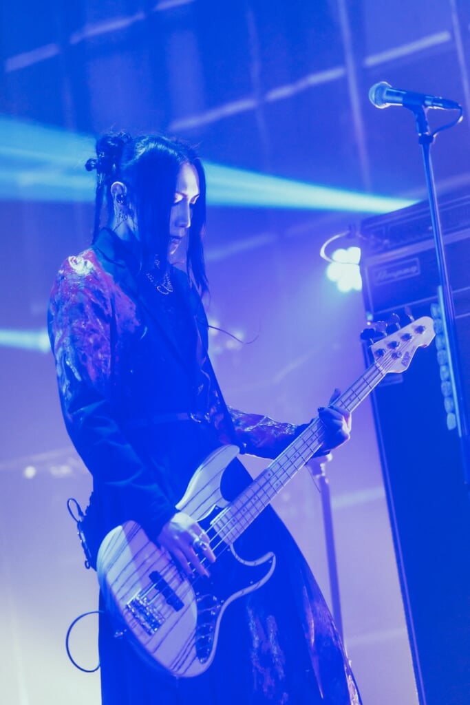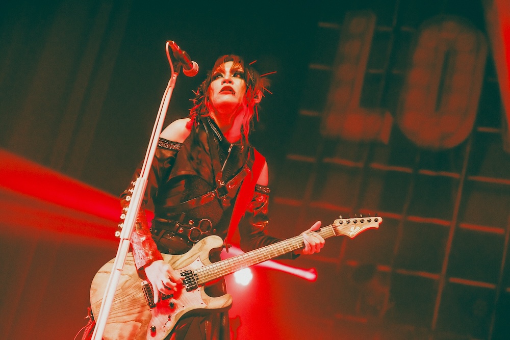 かくして、初手を指すことになったSadieは冒頭から激烈さと壮麗さの混在する「迷彩」をブチあげて、場内をいきなり狂乱の渦へと巻き込んでいくことに。しかも、この曲ではMUCCのYUKKEいわく「ずっと生で観てみたかった」という、ベーシスト・亜季が頼もしいプレイをしていくのと同時に“例の舞い”をみせる姿まで拝むことも叶った。また、続く「under the chaos」ではドラマー・景が叩き出す鉄壁のリズムと、剣(G)と美月(G)がおりなすメタリーなギターアンサンブルに煽られるかたちで、1階客席フロアのみならず2階バルコニー席でもヘッドバンギングに興じる人々が続出。ヘヴィな音像を背景に真緒が多彩なボーカリゼイションを提示した「心眼」でも、Sadieならではの貫録ある表現を堪能することが出来たように思う。