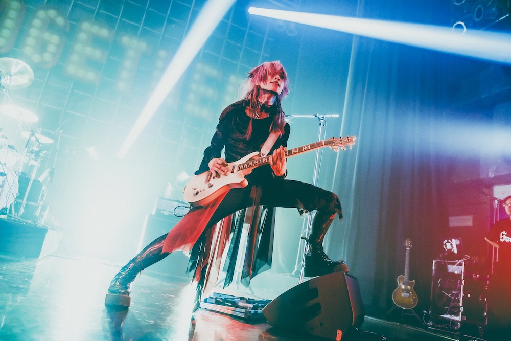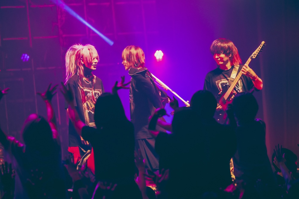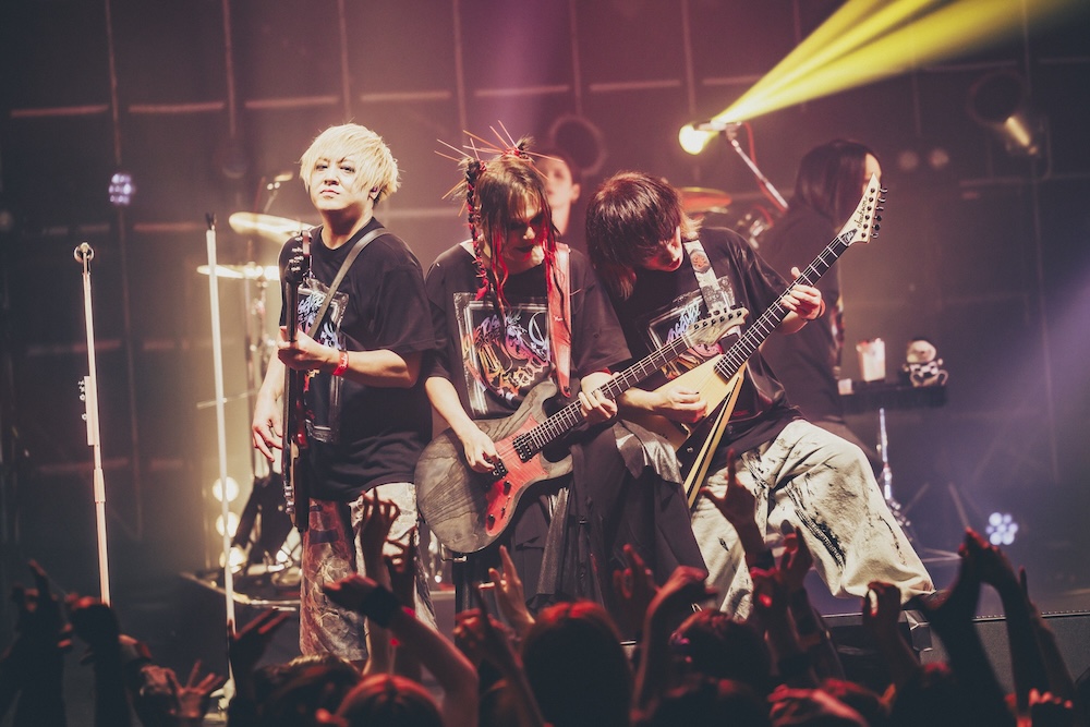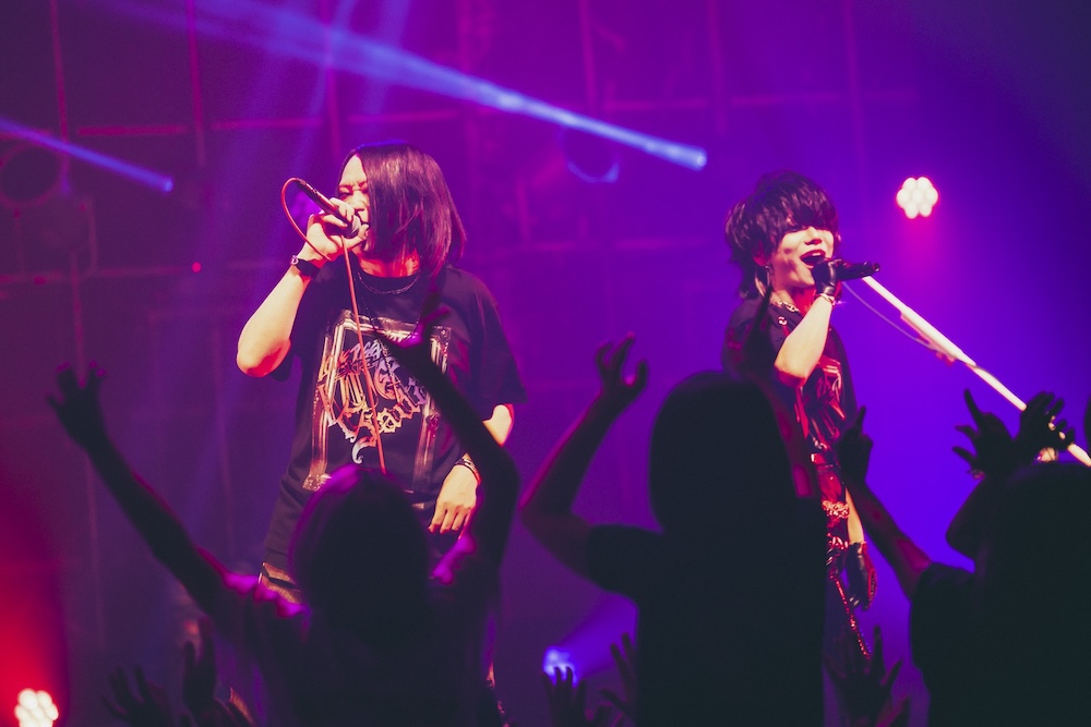さらに、ライヴが佳境に入っていく手前のMCでは美月がMUCC・逹瑯(Vo)との微笑ましい想い出を語るくだりがあり、ここで披露されたのは懐かしき<Over the Edge>における逸話だった。<Over the Edge>とは逹瑯が発起人となって2007年から始まり、旧渋谷公会堂の一時閉館まで続いた大晦日の年越しイベントだ。「ほんま昔はよくイジメられてたんです、あの真ん中のでっかい人に(苦笑)。<Over the Edge>の時なんて、全然ライヴしとる気になれなかったですもん。だって、裏で餅こねさせられとったよ。あと「大根おろし擦っとけ!」って言われたり。それも2本くらいまるごとを出番前にですよ(笑)。でも、あれから時が経ってこうしてガチンコの2マンをやらせてもらえてるなんて、本当に嬉しいです!」