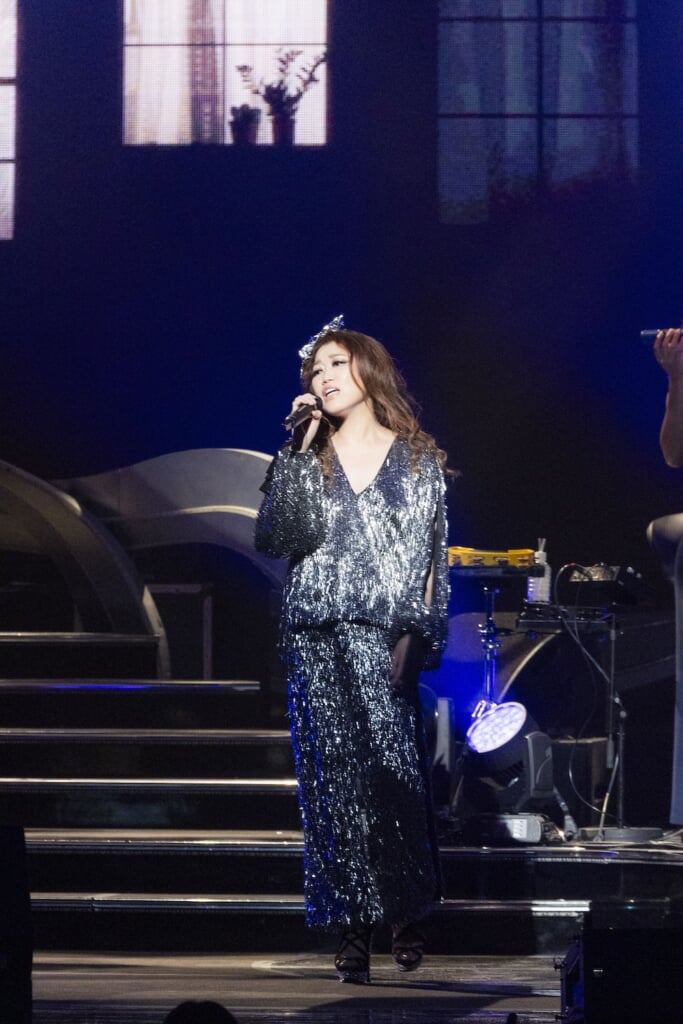 ミュージシャンソロパートを挟んだあとは、「ぐらぐら」。衣装チェンジをしたJUJUが、“この店の階段は狭くて”と始まる歌詞さながらに、階段から登場する。作詞・作曲を平井堅、アレンジを松任谷正隆が担当したこの曲は、ライブで聴くとさらに、心の奥底がえぐられるように深く響く。ここまで個性的で、痛みさえ伝わってくるような曲を、自ら解釈し物語として昇華できるJUJUのボーカル表現力は唯一無二といっていい。さまざまな窓と人影が映る背景映像も、群像劇のように想像力をかきたてられる仕上がりだ。出会った瞬間に終わりが見える恋をテーマにした「幻火」は、ストリングスが妖艶に響き、石成のギターが激しく炸裂する、とにかくクールでかっこいい曲だ。ちなみに「幻火」という曲タイトルは造語のようで、そこはかとない儚さを醸し出しているのも興味深い。その後、「一線」で会場は再び総立ちに。“令和歌謡”ともいえる「愛の嘘」や「いいわけ」は、JUJUいわく“夜の湿り気ゾーン”。夜な夜な大人達が流す、悲喜こもごもさまざまな“The Water” を想像できた人も多いだろう。