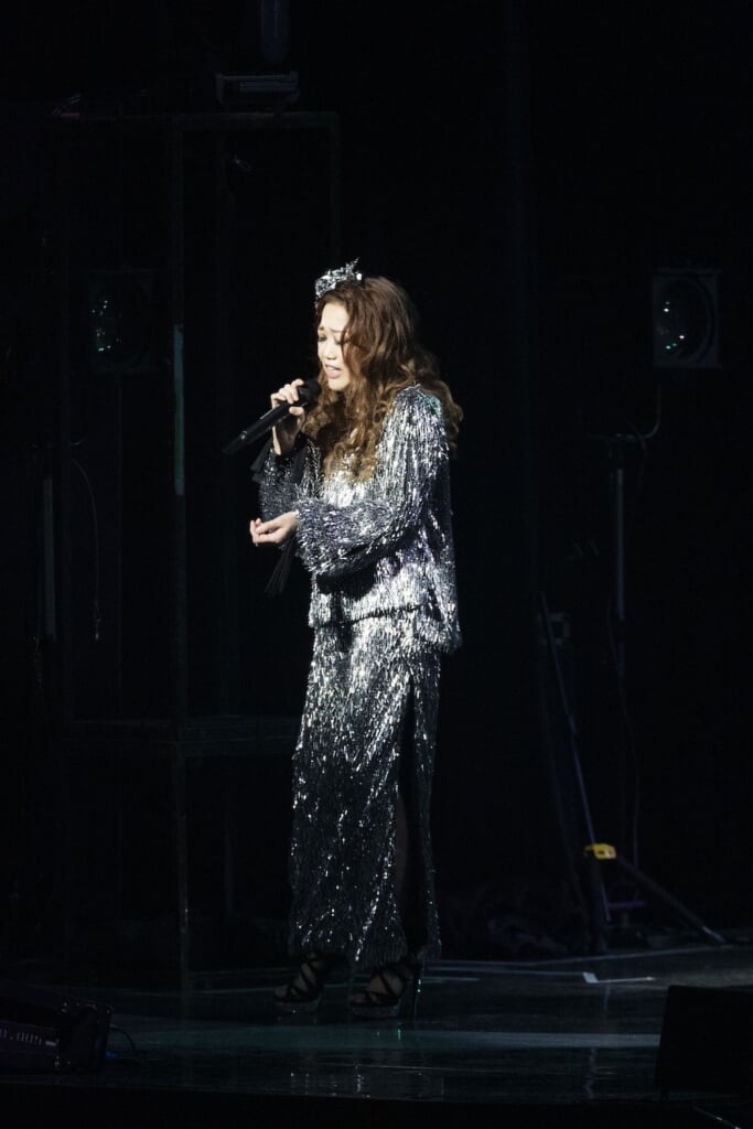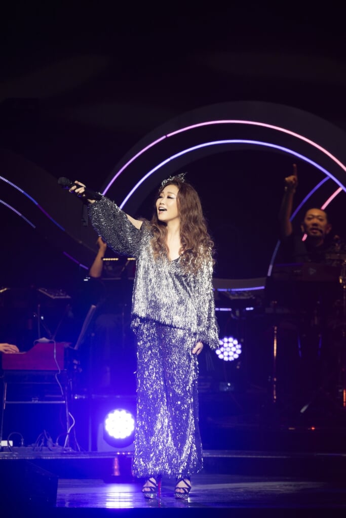 つづく「こたえ」の間奏で紗幕があがると、ステージの階段上で一音一音噛みしめるように歌うJUJUの姿が。オーロラが差しこんでいるような照明演出も美しく、ミディアムバラード「ミライ」へ。「ミライ」は『The Water』収録曲では一番古い2019年のシングルだが、歌詞のメッセージは不思議と『The Water』の世界観に合致する。3曲目の「こたえあわせ」はドラマ主題歌として人気を博したポップな曲で、会場は総立ちとなり手拍子がまきおこる。「こたえ」、「ミライ」、「こたえあわせ」という曲順も、アルバムとはまた違う物語が伝わってくる秀逸な流れだ。