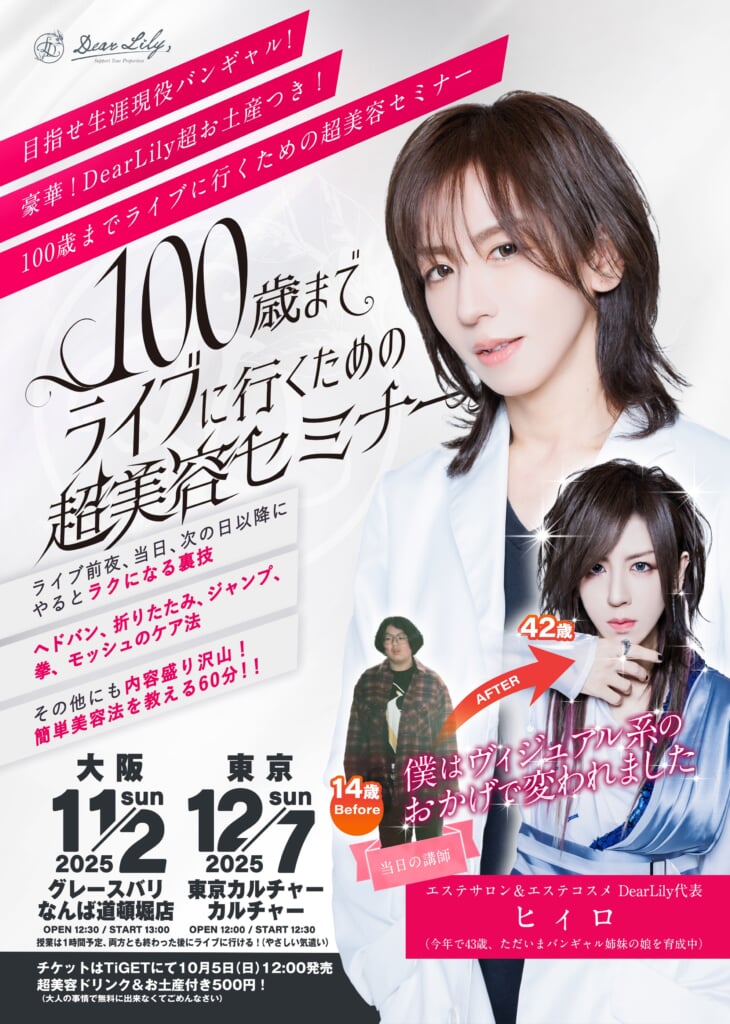 なお、『100歳までライブに行くための超美容セミナー』は、『DearLily』からの超お土産付き(化粧品)のドリンク代込み500円。チケット一般発売はTiGETにて10月18日20時から。