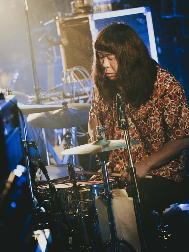 ワイシャツとジーンズにハンドマイクで「再生」を歌うYONCEは、音楽史に名を刻んできたレジェンドシンガーたちの佇まいと重なった。「再生」は音楽愛をストレートに表現した曲であり、この曲の主人公と同じように音楽を愛する人たちが集まった空間は、この時点ですでに多幸感に満ちている。次の「マンション」も、少しばかり絶望や諦念が滲む歌詞ではあるが、軽快なメロディも相まって、会場中の多幸感が続く。そのまま大内がスネアとフロアタムを勢いよく叩き、本村がトランペットを持って、祐輔がエレキを担いで同じコードを弾き続ける中で始まったのは、「説教くさいおっさんのルンバ」。これは初ライブから演奏されてきた曲であるが、何度もトランスフォームを重ねて、今や音源とはまったく別の生き物がステージ上で蠢いている。