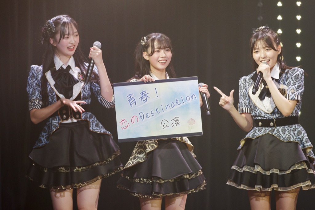 全曲の歌唱が終わったあと、キャプテン龍本が「ここで今回の公演タイトルを発表したいと思います」と切り出し、「青春!恋のDestination」公演と正式タイトルを伝えた。「女子高生の青春と恋のストーリーをお送りする公演なので、この公演タイトルを付けさせていただきました。私たち“女子高生”の青春を一緒に味わっていただき、恋の行方にドキドキしていただき、そして私たちがこの公演を通してさまざまなことにチャレンジし、成長していく姿を見守っていただけたら嬉しいなと思います」と、タイトルの由来と公演のテーマも発表した。