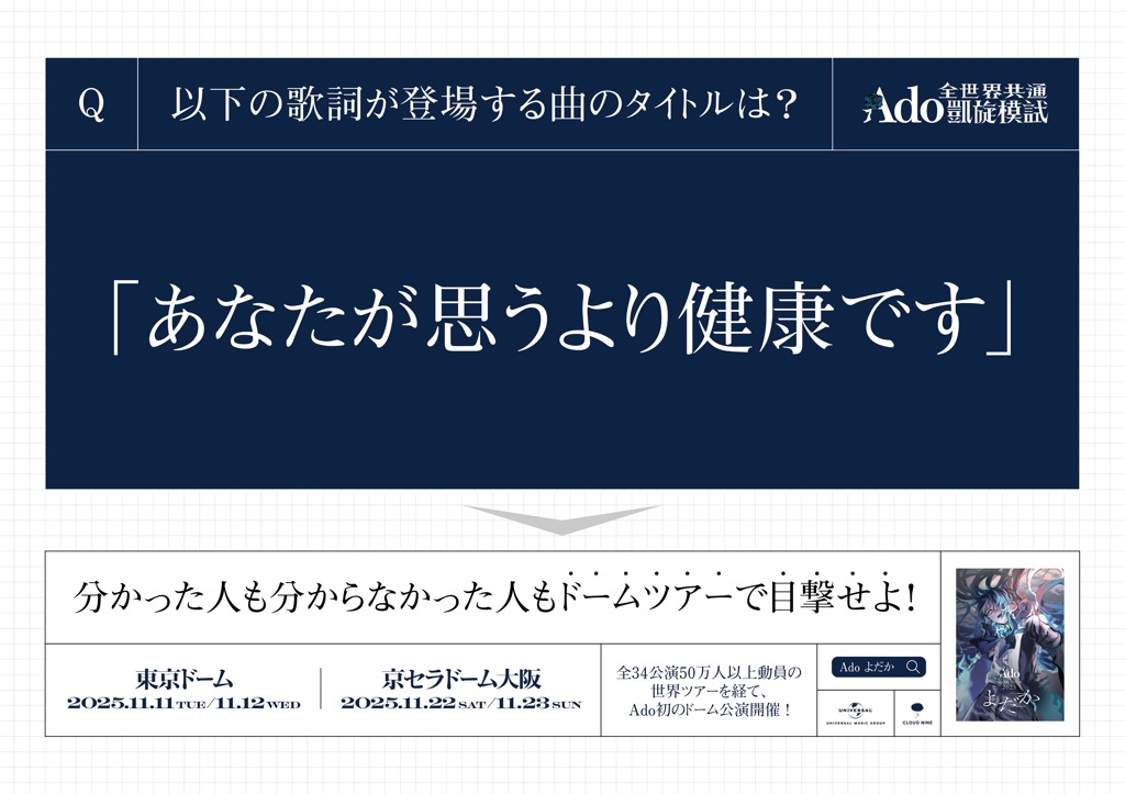 Adoが、自身2度目のワールドツアーを終え凱旋公演となるドームツアー<Ado DOME TOUR 2025「よだか」>を11月に開催する。この開催を前に、10月20日(月)より「Ado全世界共通凱旋模試」が開催されることが決定した。