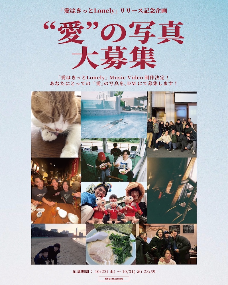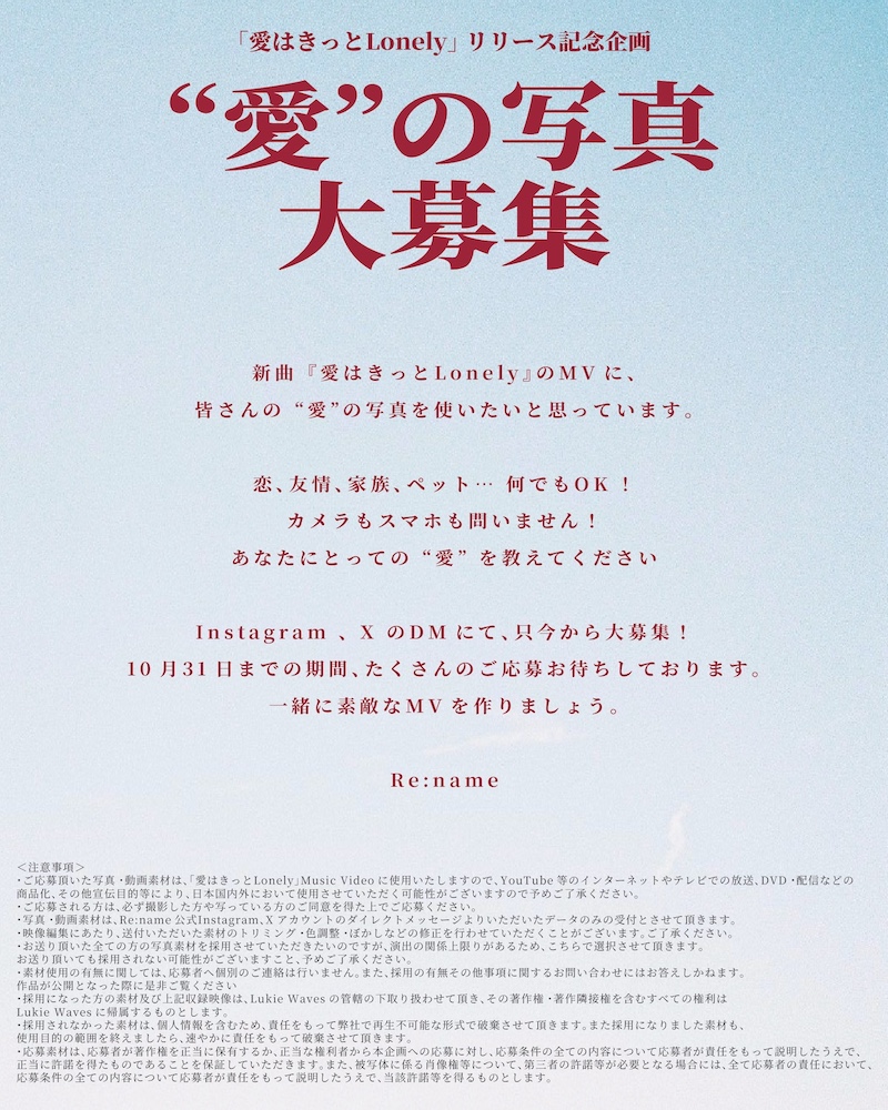 Re:name、新曲「愛はきっとLonely」配信開始。写真を募集してMVを制作