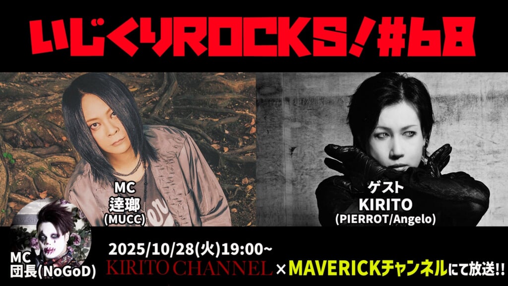 MUCCの逹瑯とNoGoDの団長がMCを務めるMAVERICK DC GROUP公式配信番組『音楽情報ライヴ「いじくりROCKS!」』と、KIRITOによる配信番組『KIRITO CHANNEL』とのコラボレーションが再び。10月28日19時より3年ぶりのトークが実現する。7月に放送された『HYDE CHANNEL』とのコラボ配信に続いて、今回もスペシャルコラボ配信として両チャンネルで同時生配信されるかたちだ。