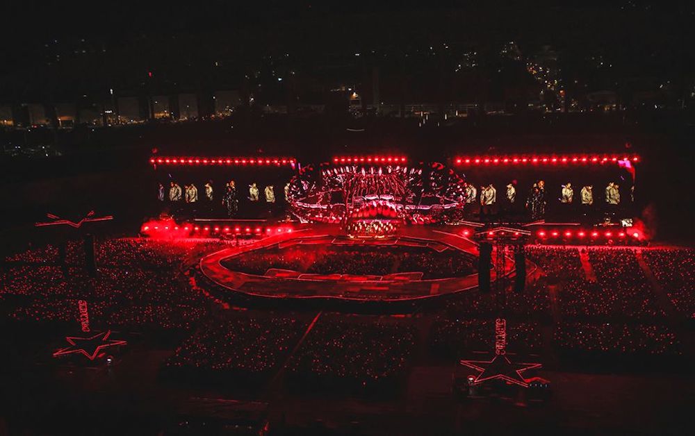 ライブは、オープニングから特効や、ファイヤーウォールなど、屋外のスタジアム公演らしいド派手な演出でSTAY(Stray Kidsのファンダム名)を熱狂させ、ライブ中盤には、ワールドツアーを通して初の試みとなる華麗なドローンショーが繰り広げられた。スタジアム上空に浮かんだドローンたちは、Stray Kidsを象徴するワードやデザインを次々に作り出し、観客を大いに盛り上げた。