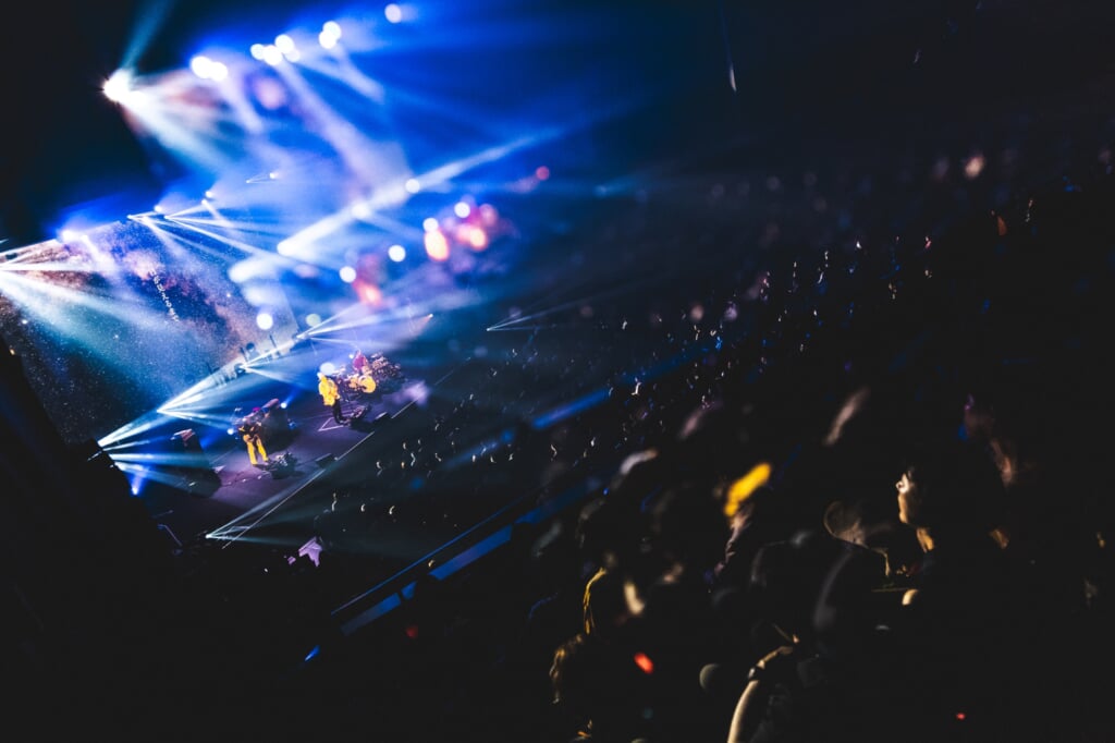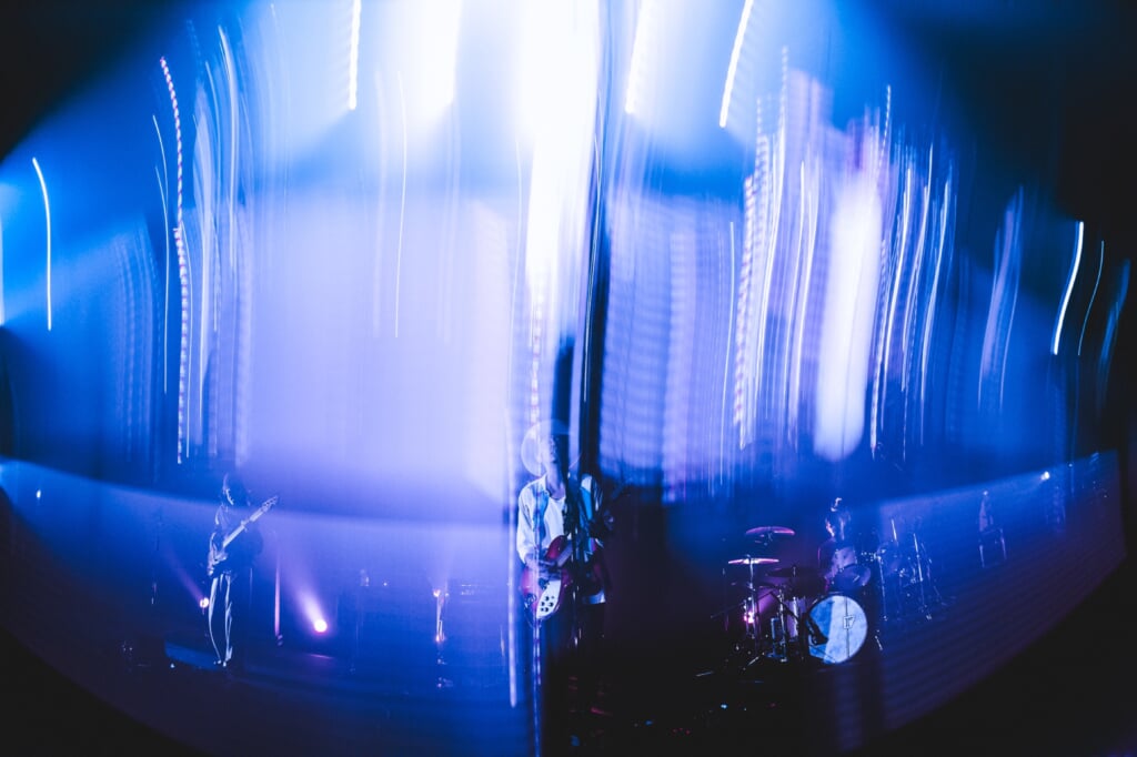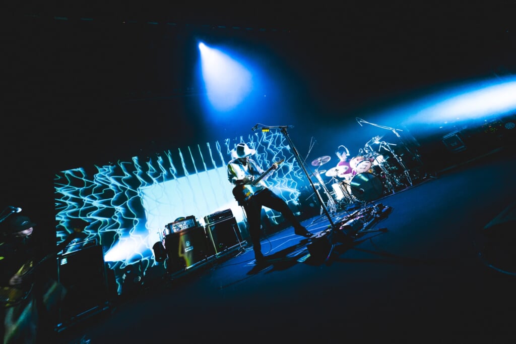 まずは2006年発表の12thシングルおよび5thアルバム『green chord』収録の「プリズムの夜」、2005年発表の9thシングルおよび4thアルバム『and world』収録の「季節の灯」が続く。ここではじっくりと曲と3人の演奏にスポットが当たるようなステージを展開。淡々と時を刻むようなビートとベースライン、柔らかに憂いを帯びたボーカルが冴えるメロディによる「プリズムの夜」は、ストリングスが入って色づくように熱を帯びていく間奏パートからの後半で、のめり込むように聴き入っていた観客の体温が上がるのがわかる。