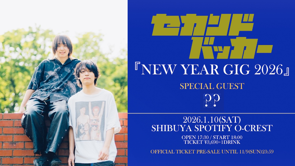 ソングライター兼ギターボーカルのこうへいと、ドラマーのまさみから構成されるセカンドバッカー。EPリリース後に収録曲の「犬とバカ猫」がSNSを通じてヒットし、10月にはゴールデンタイムの音楽番組への出演を果たすなど、飛ぶ鳥を落とす勢いの彼らを目撃するべく会場には多くの若い男女が集まった。
