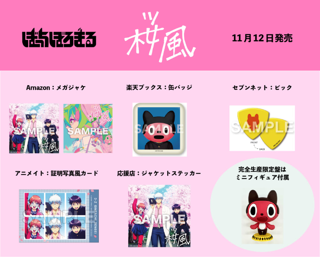 「桜風」のCDは、11月12日に発売することが決定している。期間生産限定盤は、7inchレコードサイズアニメ絵柄描きおろし紙ジャケット仕様となっており、完全生産限定盤は、ぼっちぼろまる オリジナルフィギュア付き仕様となっている。各CDショップの特典絵柄も解禁されている。是非ともチェックしていただきたい。