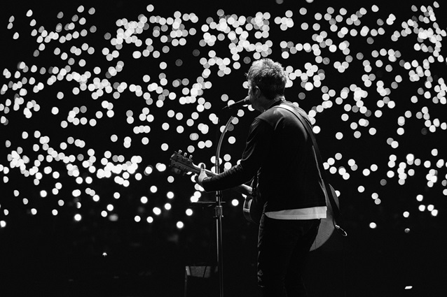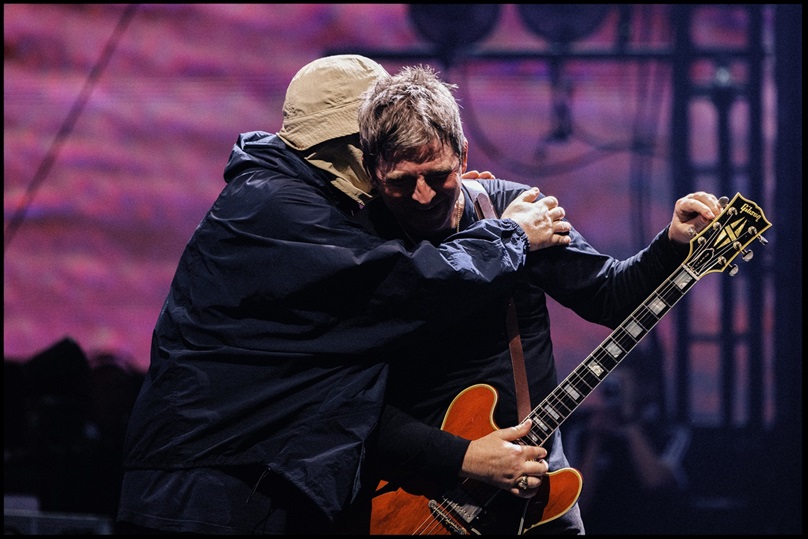 さあ、会場からの拍手と歓声が最高潮になりリアム(Vo)がステージに登場! 右手にマラカス、そして左手には兄ノエル(G, Vo)の右手を繋いで高く掲げて歩いている。ノエル自身は両手を上げ、その表情に目を映すと、笑顔だ。混じりっ気のない、純粋な喜びの笑顔。肉眼ではっきり目撃し、こちらまで嬉しくなる。そしてリアムはマラカスをパッと落とし、両手でアニキを抱きしめた。実感する──フェイクなんてとんでもない、見せかけの仲の良さでもない。このハグは、“よし、やるぞ”という兄弟たちの気合い注入の儀式だ。この夜が素晴らしいものになる予感のみ、そこにはあった。
