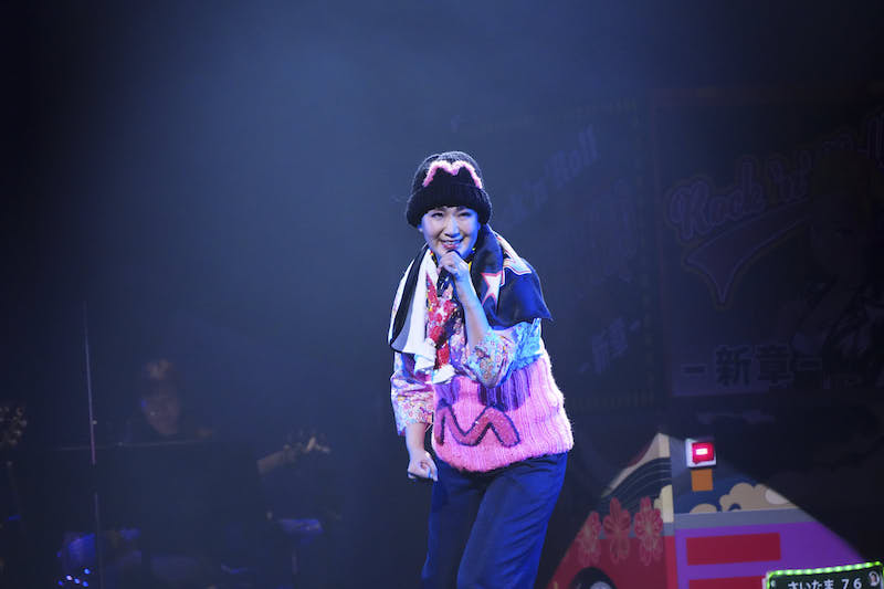 後半は〈トラック野郎 ゆき五郎〉というテーマでスタート。これは23年の暮れに亡くなった八代亜紀へのトリビュートであることは明らかだ。八代亜紀は77年に映画『トラック野郎・度胸一番星』に女性トラック運転手“紅弁天”役で出演し、その美しさにそれ以降、全国の長距離トラッカーたちのマドンナとして絶大な支持を集めた。ここでは、市川は架空のトラッカー・ゆき五郎として、黒のニットキャップとピンクの腹巻きにMと書かれた(本名が真利なので)コミカルな出たちで登場。デコトラを模したワゴンも登場した。