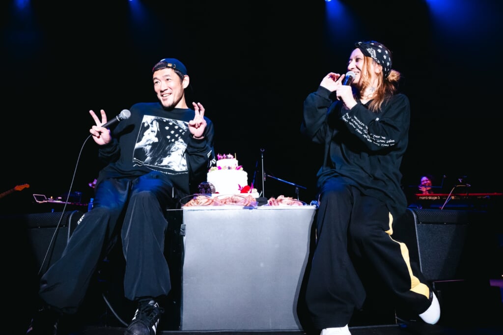 アンコールでは、THE HARMONIESが清春のお祝いに駆け付けた。枕風(Vo)、サーベル・ミケ・健(Sax)、不知火・キャプテン・エレナ(Pf/Vo)と名乗る3人組は、2024年の清春ツアーのアンコールステージで生まれた新人バンド。彼らは今年、初のワンマンツアーを開催するなど、日に日に存在感を増している。巧みなアレンジで邦楽の名曲群をカヴァーする彼らが今宵の祝宴に選んだのは、安室奈美恵の「CAN YOU CELEBRATE?」だった。SATOKOをコーラスに加えての特別編成で披露された祝福ソングに観衆は驚きと喜びを隠せない。