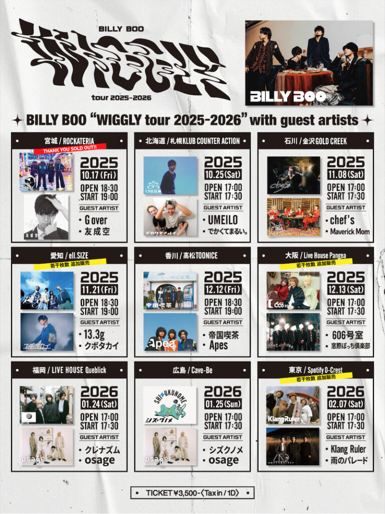 また、10月より開催しているBILLY BOOの全国対バンツアー<BILLY BOO “WIGGLY tour 2025-2026”>に関して、大阪・愛知・東京公演が既に完売となっているが、完売公演へ多数の問い合わせを受け、10月30日12時より、若干枚数の追加販売がを先着受付がスタートするので、ぜひチェックしてほしい。