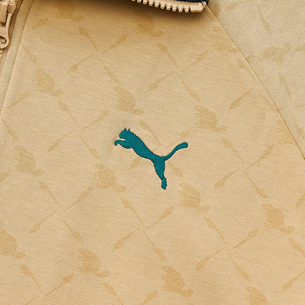 ボディには、PUMAの定番であり現代的で洗練されたシルエットの「T7」をベースに採用し、ジャケットは身幅を広めに、パンツはワイドにアレンジ。カラーリングと総柄のデザインもコラボレーションならではの特徴となっており落ち着いたトーンのベージュは、どんなスタイルにも合わせやすく、年齢や性別を問わず着こなせる汎用性の高さもポイントだ。また、ジャケット全体に施された総柄には、PUMAの象徴である“フォームストリップ(プーマライン)”と、SUPER BEAVERの“ビーバー”が一緒に描かれていて、日常使いにも落とし込みやすいデザインになっている。