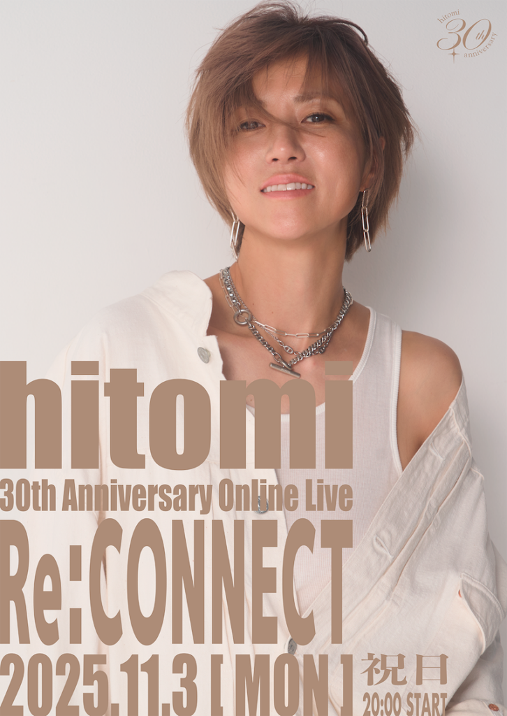 CDデビュー30周年を迎えたhitomiが、明日11月3日の“ヒトミの日”に、自身初となる無料オンラインライブ<hitomi 30th Anniversary Online Live / Re:CONNECT>を開催する。