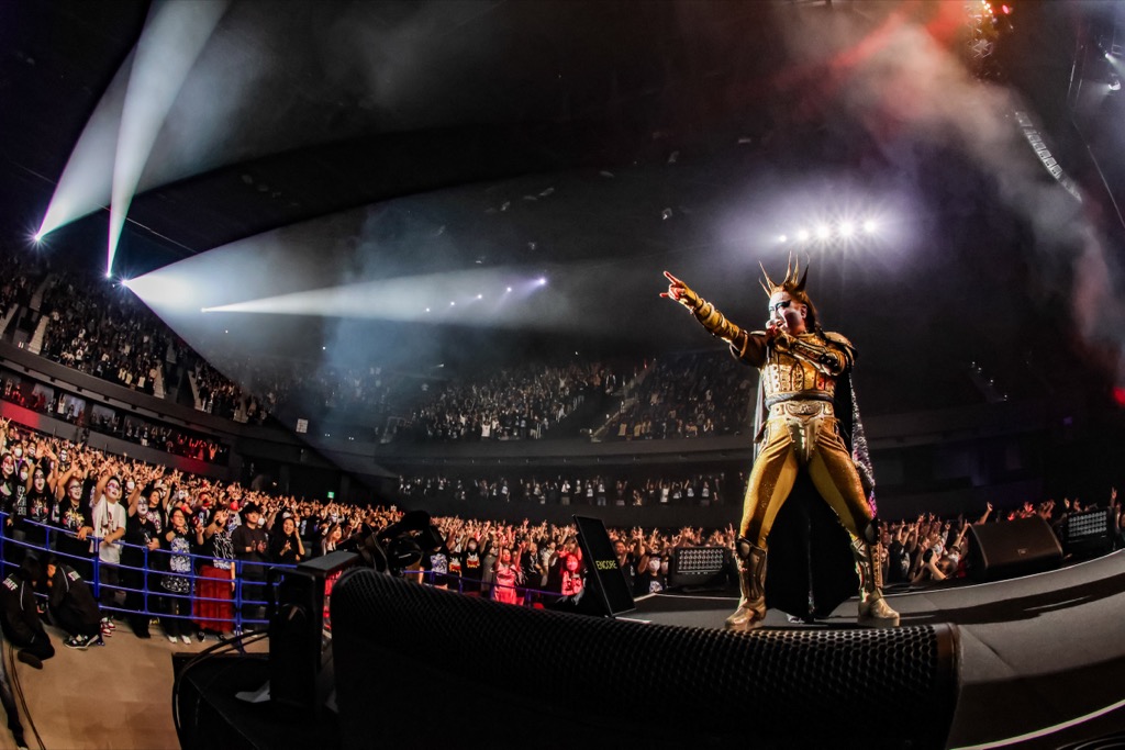 中盤ダミアン陛下が、聖飢魔Ⅱのサポートとしても知られるKAMISORI SYUTOを呼び込むと、次に放たれたのは6月6日に先行配信されたばかりの「666」。陛下が語るには、この曲は神に失望した人間たちの苦悩と反逆の象徴であり、その「666」という数字には“Rock Rock Rock”という叫びをも掛け合わせたという。イントロが鳴った瞬間、観客が沸騰する。怒号のような「Rock! Rock! Rock!」のコールが巻き起こり、音と声と光が渾然一体となってアリーナを呑み込んでいく。誰もが拳を突き上げ、叫び、誰もがこの瞬間に生きていた。