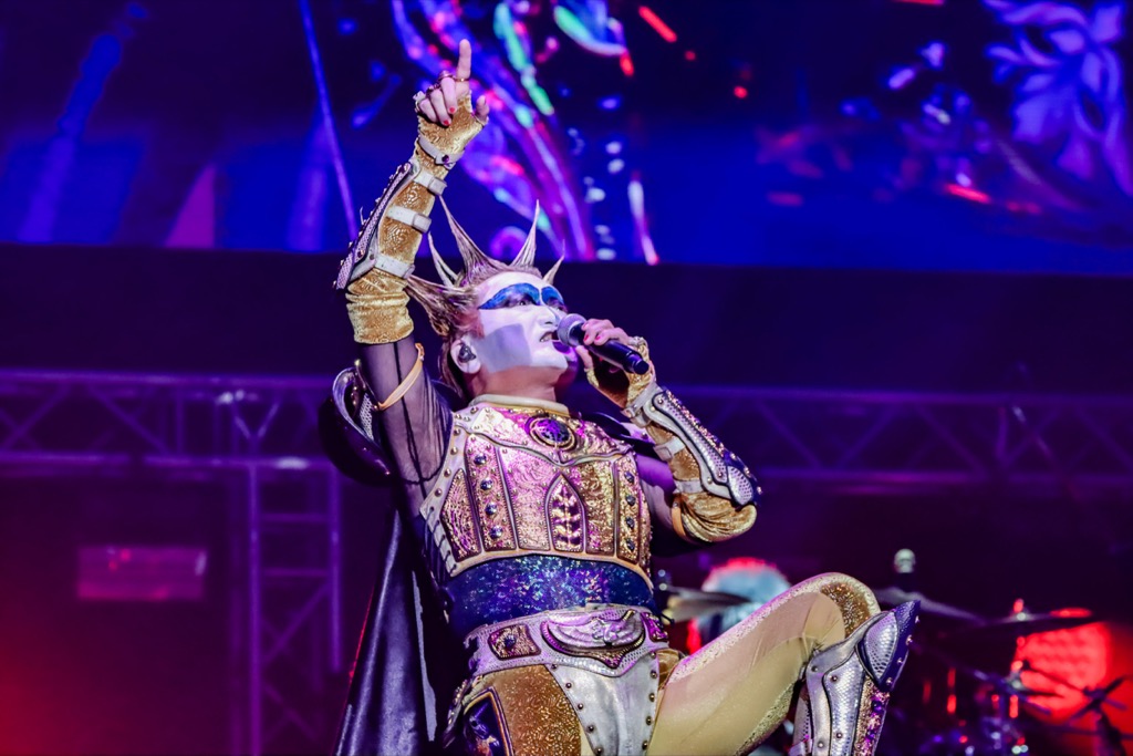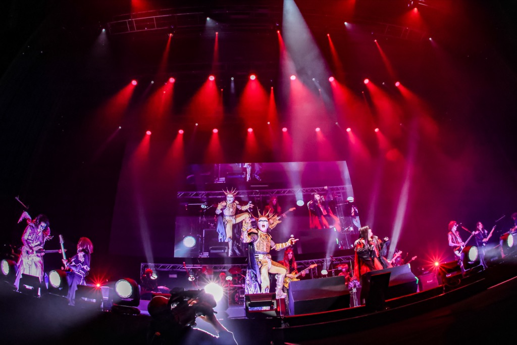 うねりに漂う観衆に、最新大教典の明快なメッセージソング「Next Is The Best!」が急襲、本年の全国ツアーでも披露していない曲にコアな信奉者たちがたちまち熱狂の悲鳴をあげた。平均年齢10万61歳を超えていることが信じられないパワーの塊に驚愕していると追い打ちが来た。聖飢魔Ⅱのゼッタイ看板曲「Fire After Fire」。エナジーと貫録はその名の通り炎のようなど肝を抜くステージングで嵐のような本編フィナーレを迎えた。