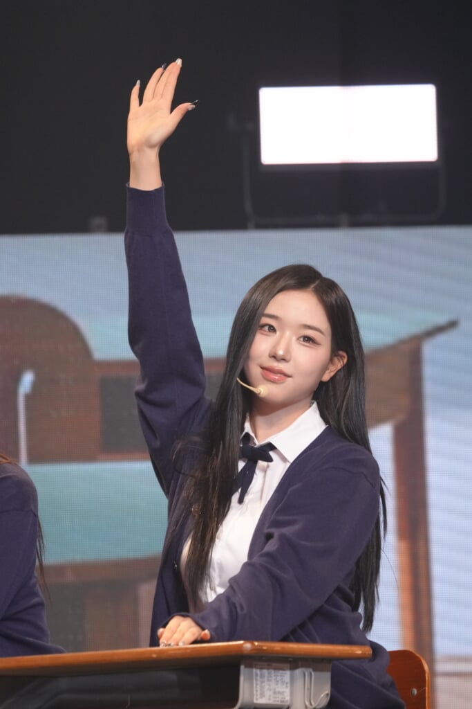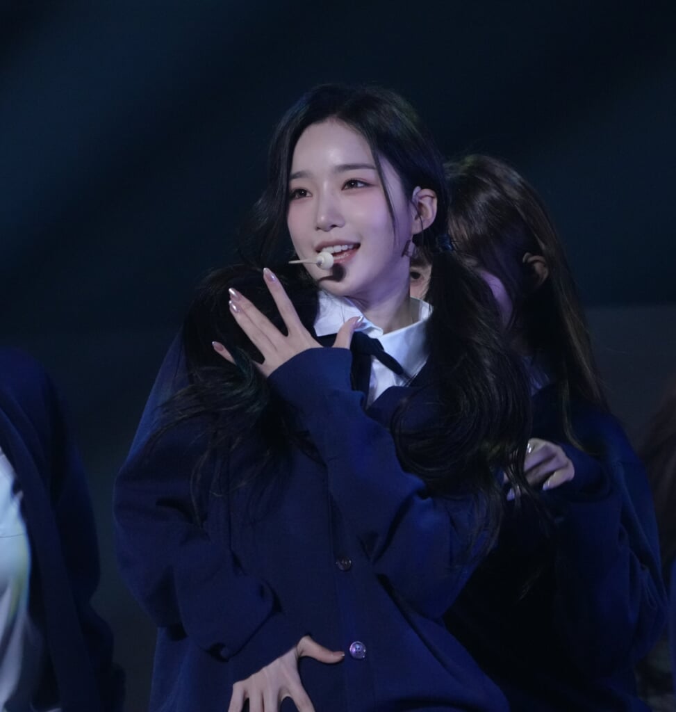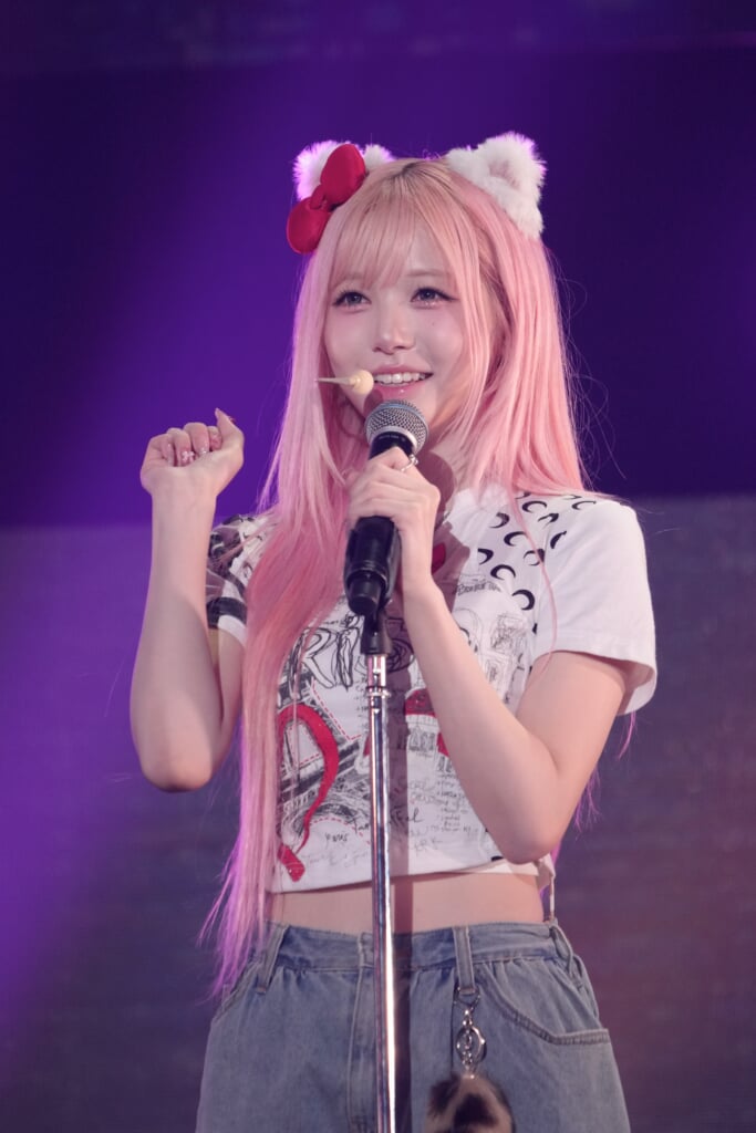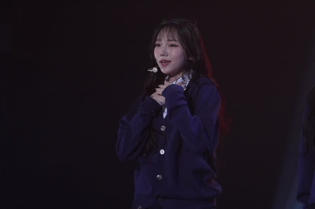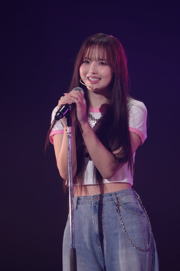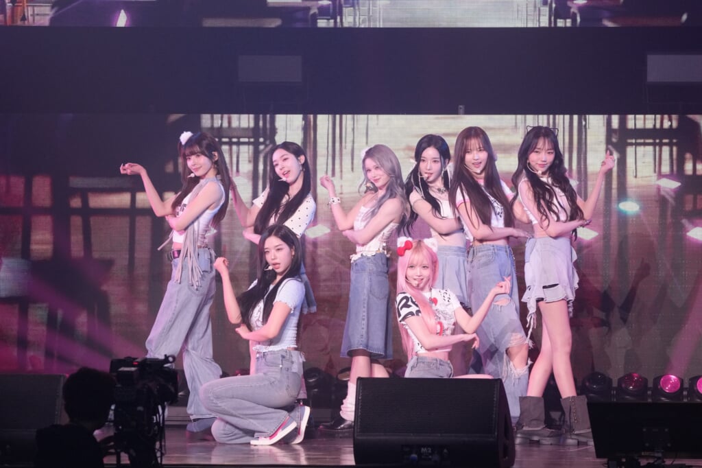 歌い終えた8⼈は元気⼀杯に挨拶。早くもヒートアップした会場をさらに盛り上げようと、今度は⽇本デビューシングル「アンタイトル(Untitled)」を披露した。クールなドラムンベースに⾝を任せるように踊り、“無限の可能性を秘めて今動き出す、まだ名前のないストーリー”を歌い上げる彼⼥たち。間髪を⼊れずに始めた「Invincible」では、どんな試練と逆境の中でもダイヤモンドのように壊れない⾃我を表現するなど、両曲を聴くだけでも、他のアイドルとは異なるベクトルを突き進んでいることが理解できるはずだ。
