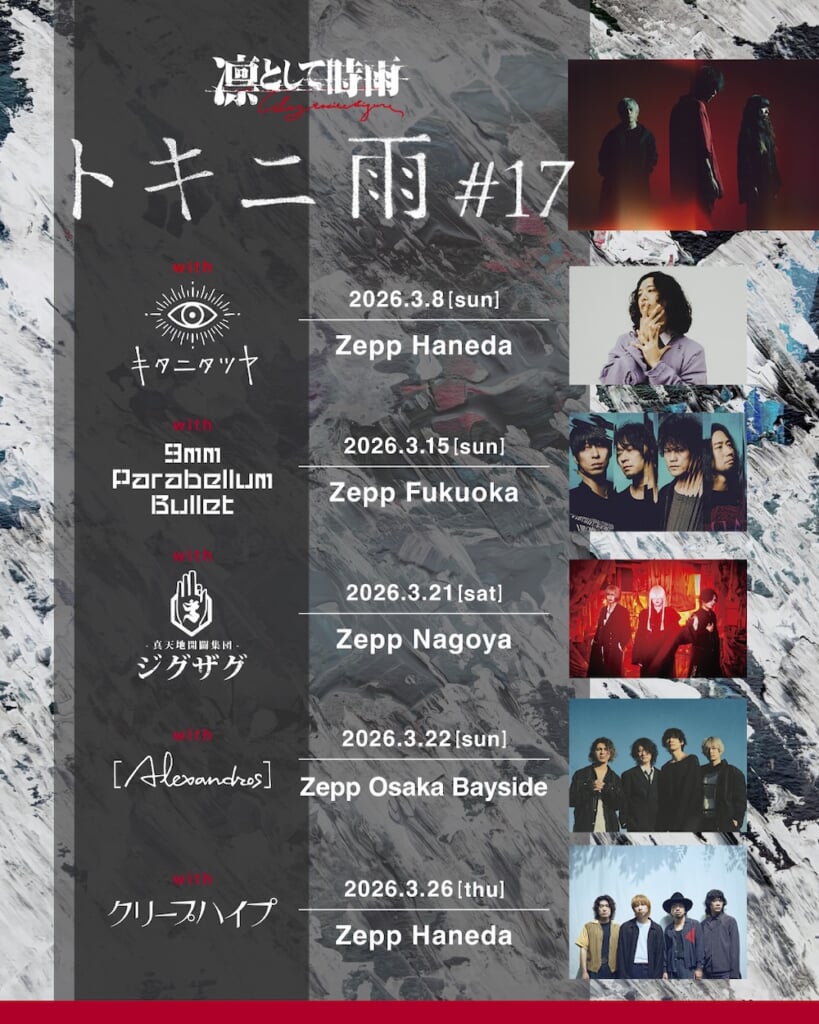 今回のツアーのファイナルにあたる12月27日は凛として時雨にとって実に12年ぶりとなる日本武道館での単独公演。「Tornado in Budokan」というタイトルがつけられ、この日ならではの特別な曲も披露されるのか、期待が高まる。さらに、2026年3月には約3年ぶりとなる自主企画対バンツアー<トキニ雨>の開催も決定。キタニタツヤ、9mm Parabellum Bullet、-真天地開闢集団-ジグザグ、[Alexandros]、クリープハイプという強力な対バン相手が揃い、どんな科学反応が生まれるのか。「失神蠍 TOUR 2025」を経て、さらなる進化を遂げた凛として時雨のステージから目が離せない。