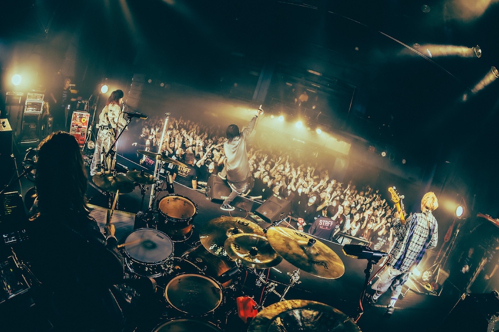 とミヤが言い放ったあと、唐突にお披露目されたのは16ビートが心地いいハネ系ギターロックサウンドにMUCCみの強いキャッチーな和メロをのせた「夜風(よるかぜ)」。12月10日発売予定のニューシングル『Never Evergreen』に収録されることがインフォメーションされている1曲だが、百戦錬磨の夢烏たちはまっさらの新曲でもおかまいなしにガッツリと食らいついていくから頼もしい。客席フロアは、たちまち曲にあわせて飛んだり跳ねたりする人々であふれかえることになったのだった。