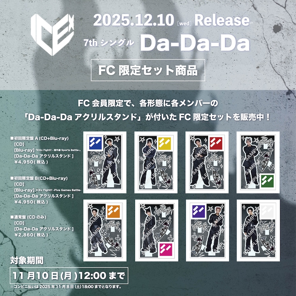 ICEx公式ファンクラブ”ICEx COOLer BOX”会員限定で、7thシングル「Da-Da-Da」各形態に各メンバーの「Da-Da-Daアクリルスタンド」が付いたFC限定セットを販売いたします。期間限定ですので、お早めにご予約ください。