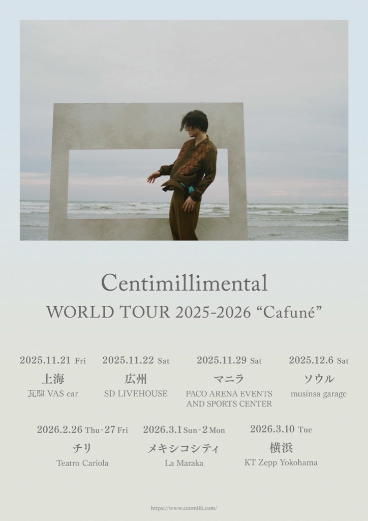 また、センチミリメンタルは、11月より自身初となるワールドツアー<Centimillimental WORLD TOUR 2025-2026 “Cafuné”>を開催。本日、日本追加公演として、2026年3月10日(火)に神奈川・KT Zepp Yokohamaで公演を行うことが発表された。センチミリメンタルのオフィシャルファンクラブ「Atelier C」では、本日11月9日(日)20:00よりチケット先行受付がスタートしている。