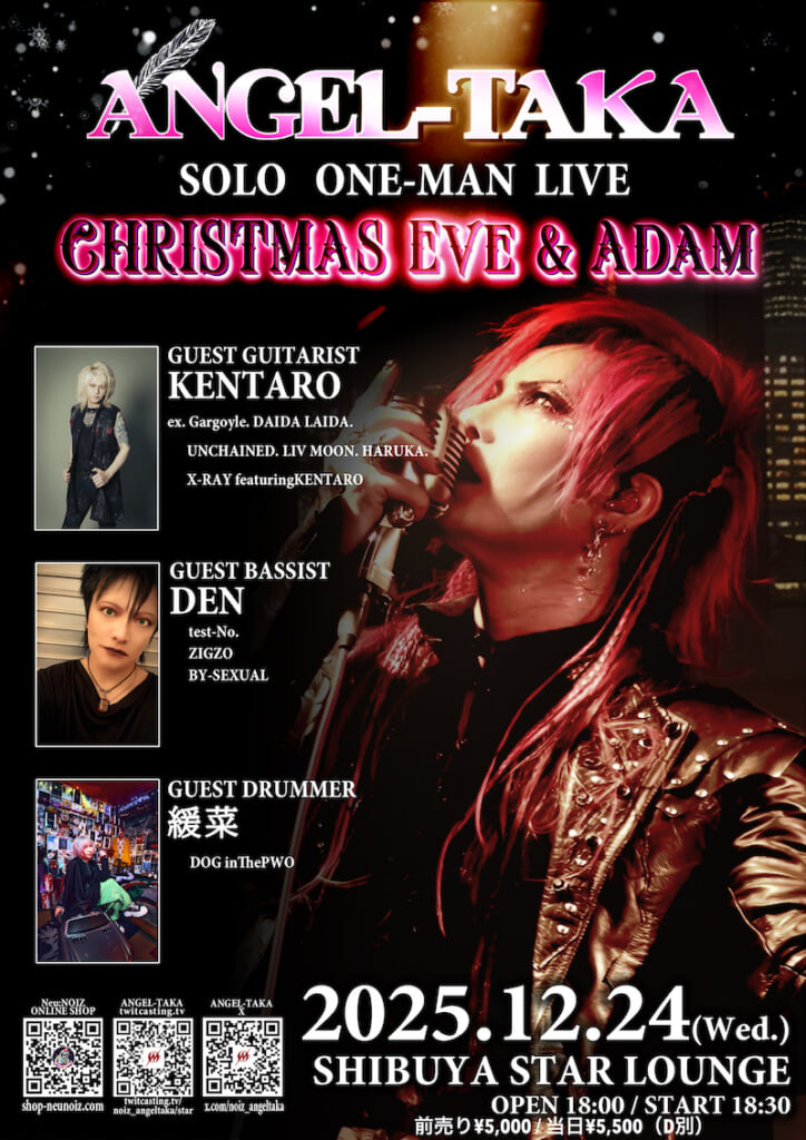 ANGEL-TAKA:ゲストメンバーの皆さんには、僕と一緒に音楽をして楽しかったと思ってもらえたら嬉しいですね。愛を持って、音を、ステージを、共に目一杯楽しみたいです。ゲストメンバーのファンの皆さんもよろしくお願いします!一緒に楽しみましょう!初めての試みなので、色んな風に感じている隊員がいると思います。もしかしたら、不安に感じている人もいるかもしれないけど、ソロの始動はNeu:NOIZの活動にとっても、ポジティブなことだと思っているので、安心してついてきてほしいな!Chiristmas Eve、逢いにおいでよ☆