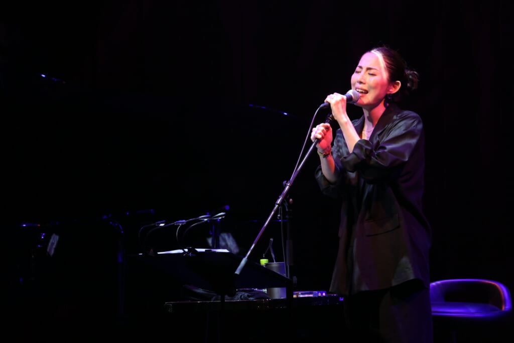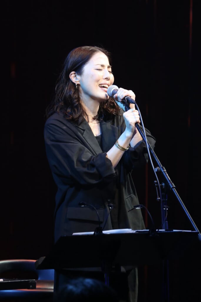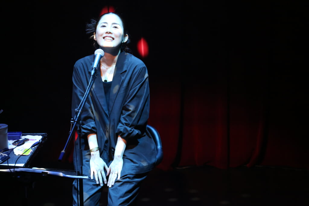 歌詞に出てきた“お祭り”についてのトークを挟んだ後にはカヴァーも届けられ、「この曲を最初に歌ったのは20年以上前のイベントで、自分と重なる部分が多くて大切にしてきた」というオフコースの「言葉にできない」もまたこの日のハイライトでした。本家の小田さん以外に歌える人が何人もいるとは到底思えないこの難曲を、艶やかなピアノ伴奏にのせて今にも泣き出しそうな情感溢れる歌で表現。続いて、壮大にして力強く、伸びやかに「タイムカプセルの丘」を届けると、類い稀なその歌力に涙ぐむ人もいて、観客からは惜しみない拍手が送られました。