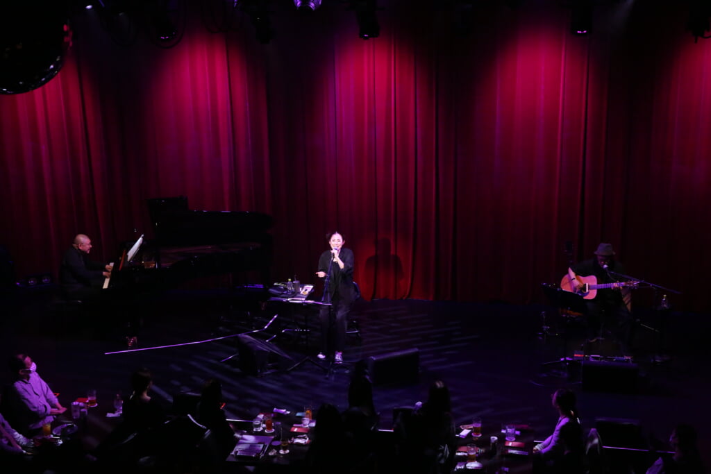 この日、隣のテーブルにはドレスアップした女性2人組が、おしゃべりを楽しみながら開演を待っていました。ライブが始まると長年のファンなのでしょう、新旧問わず、すべての楽曲で音に合わせて体を揺らしていた彼女たち。グラスが空くと互いにワインを注ぎ、MCに笑い、涙歌になるとハンカチで涙をぬぐい、グラスを傾けクイッと一口流し込んでからまた涙を拭ってステージを見つめる。そのひとときを音楽と友と共に嗜む姿は傍から見ていて魅力的でしたし、アーティストもファンも年を重ねてこそのライブの楽しみ方があるということを気づかせてくれたのでした。