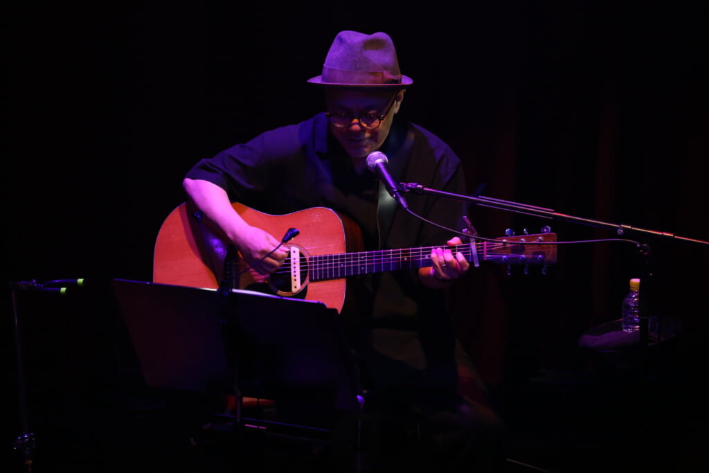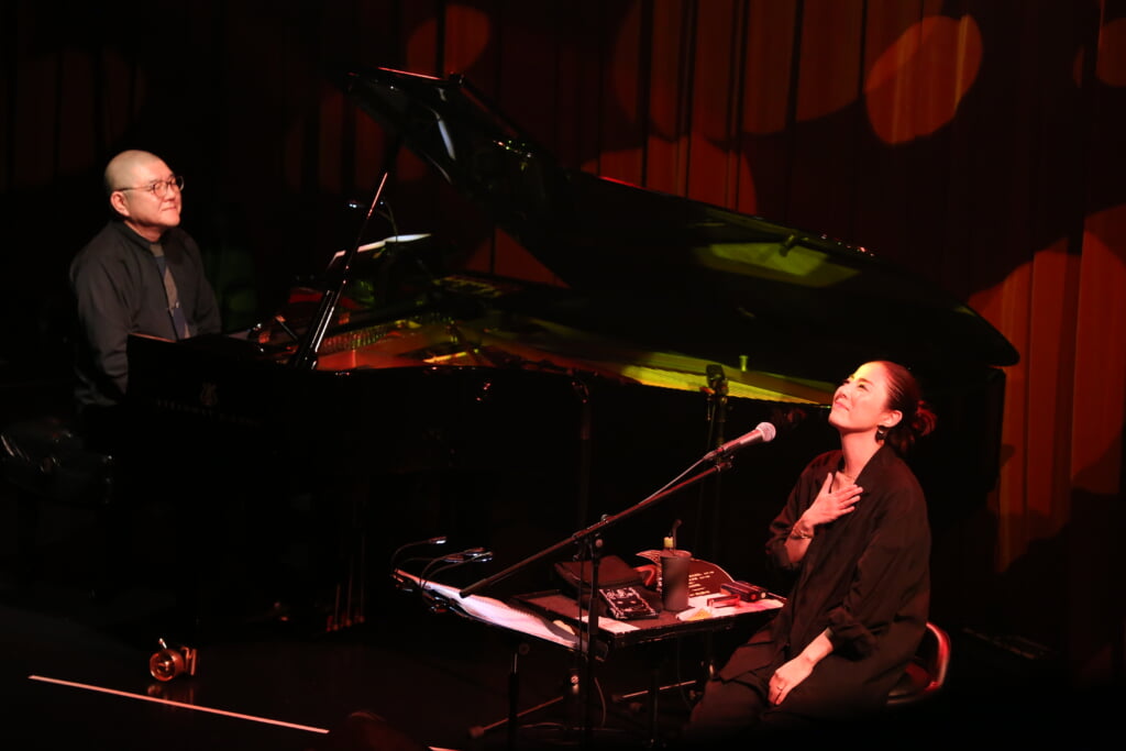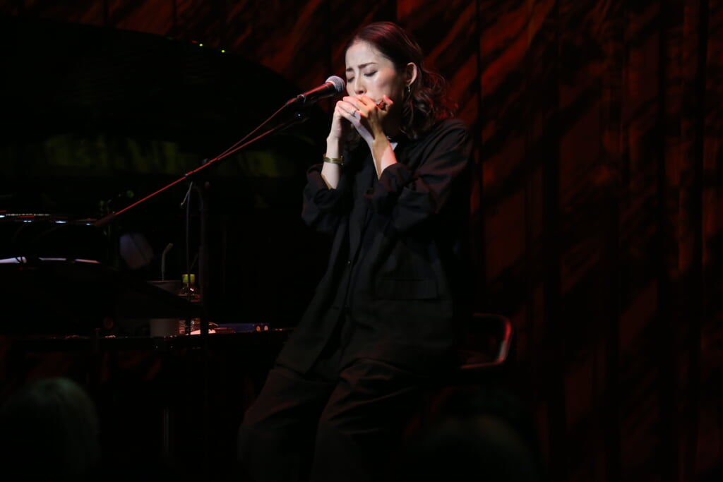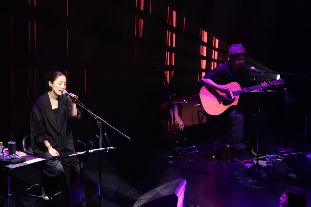 ラストは、それまでの空気を一変させる軽やかなギターのリフで始まった「ただの私」。明るい世界が開かれた舞台ではギターとピアノの息がぴたりと合い、ブルースハーブも加わって、たった3人とは思えない音の厚みと深みのある演奏で盛り上げて本編が終了しました。そしてアンコールでは季節を感じさせる童謡「赤とんぼ」が披露され、神々しい歌声を支えるようにギターのアルペジオとピアノがドラマティックに彩り、いつもにはない新たな余韻を残して締めくくられました。