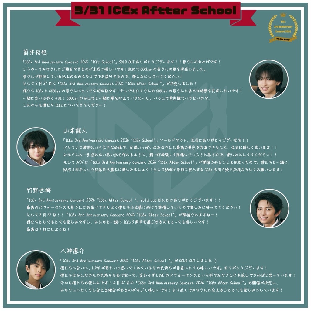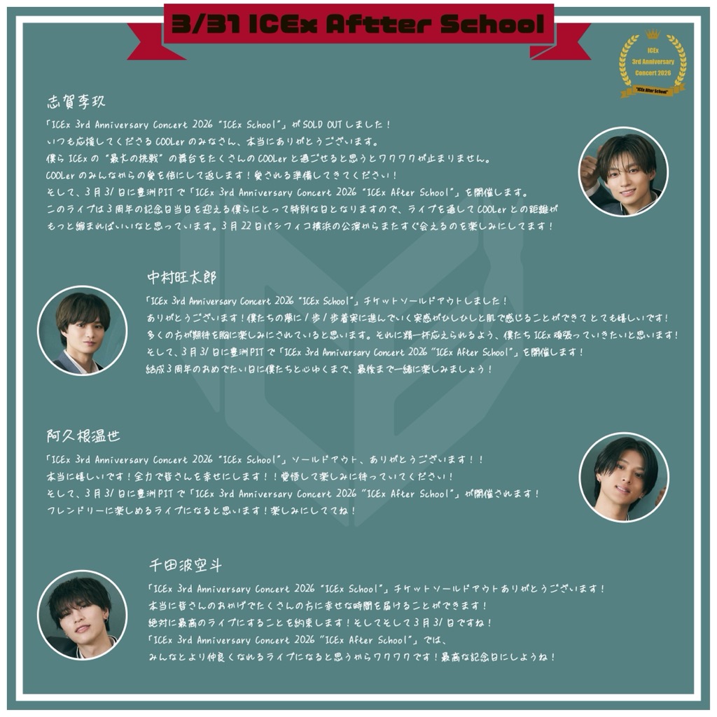 <ICEx 3rd Anniversary Concert 2026 “ICEx School”>がSOLD OUTしました!いつも応援してくださるCOOLerのみなさん、本当にありがとうございます。僕らICExの“最大の挑戦”の舞台をたくさんのCOOLerと過ごせると思うとワクワクが止まりません。COOLerのみんなからの愛を倍にして返します!愛される準備してきてください!
