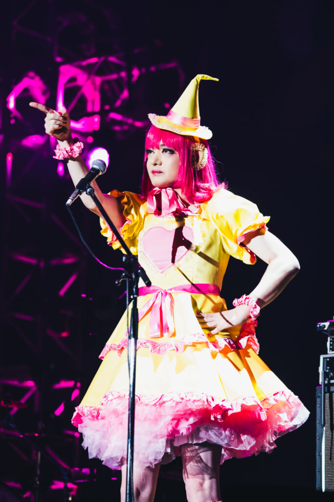 さらに「Psycho le Cémuの世界へようこそ! おまえたちに送ります」と、DAISHIはメジャーデビュー曲「愛の唄」をタイトルコール。ようやく全員が楽器を演奏するフルバンドスタイルでキャッチーなメロディが奏でられ、後方ではYURAサマがタイトなビートを放ち、ピンク色に染まったステージではLidaとseekがピョンピョンと飛び跳ねる。サビではAYAが振りをリードして、間奏ではLidaの爽快なギターソロが! まさにタイトル通りの多幸感で会場中を満たしてみせた。